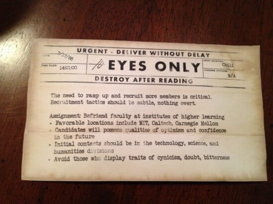 Upon arriving home, Jeremiah opened the can only to find an “EYES ONLY” message dated 7/17/66 – Disneyland’s 11th birthday. The time? 14:01:00 – the street address of Walt Disney Imagineering on Flower Street in Glendale, Calif. The message? An assignment to “befriend” faculty at university’s like MIT, Caltech, or Carnegie Mellon. The purpose? Unknown.