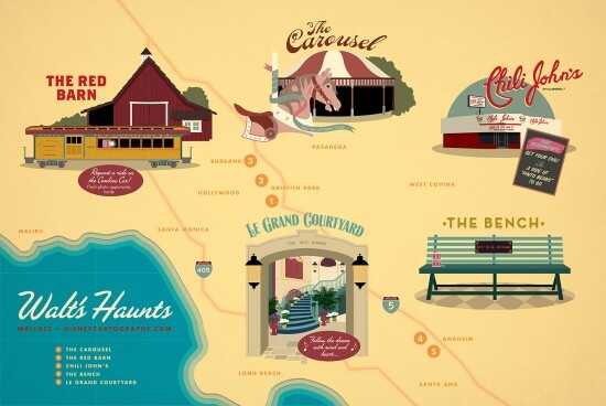 The piece pictured above is called “Walt’s Haunts,” depicting a few of Walt Disney’s favorite places. But each also offers a clue to something new for The Optimist.