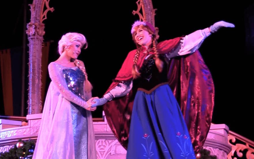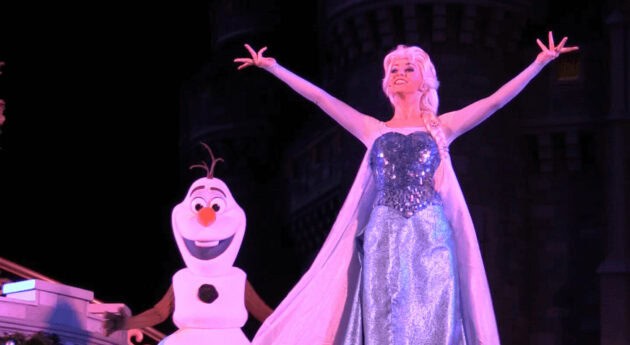 There’s no singalong of “Let It Go” in this stage show, though strains of the song are heard mixed in with some new holiday music. Elsa swirls her magic via projections on Cinderella Castle before its thousands of twinkling lights brighten along with a few pyrotechnic blasts.