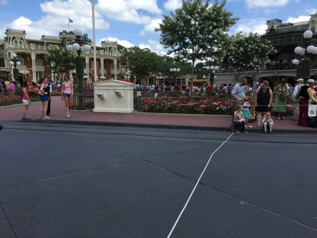 This whole area is typically used as a walkway for those exiting the park prior to the parade. So, most guests have no idea that it is quickly going to become one of the best viewing areas along the entire route. If you stand anywhere along this rope or tape, you will see the parade coming directly at you, before it makes the slight left turn to exit the park. In all of the years I’ve been coming to the Magic Kingdom, I’ve yet to find a better view.