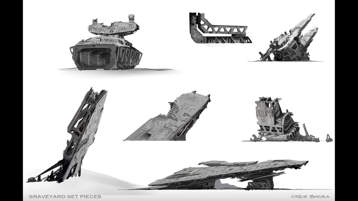 “Each artist began to explore his individual response, and collectively, we began to answer, with our words and art,” wrote Rick Carter, co-production designer for Star Wars: The Force Awakens. “Out of our brainstorming sessions emerged visual imagery of where we might want to go and what it would look like when we got there. We were not merely illustrating scenes that already existed: we were initiating storytelling concepts through the visual images themselves.”