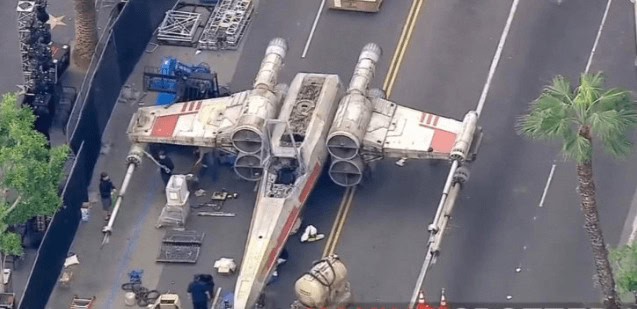 Just this past Tuesday, an X-wing landed in Tinseltown–undoubtedly for the film’s debut where stars and fans alike will gather in just a few days. Not surprisingly, the jet was quickly spotted. [X-wings are not so easy to hide, ya know]. Pictures and video went viral because….I mean, when do you ever get to see a life-size X-wing from a galaxy far, far away?!