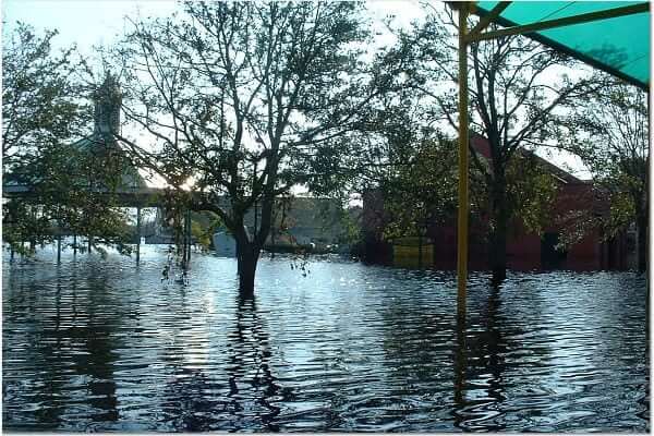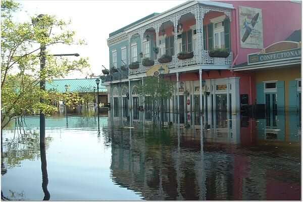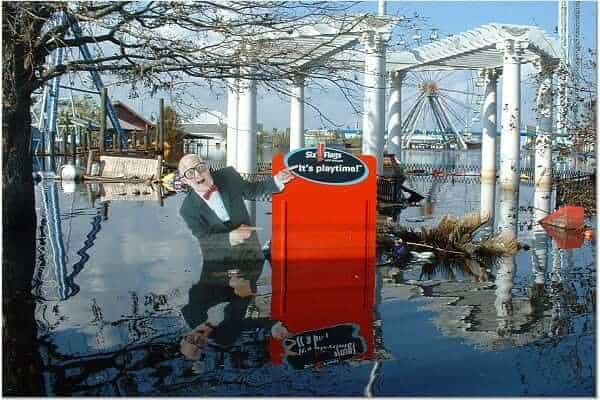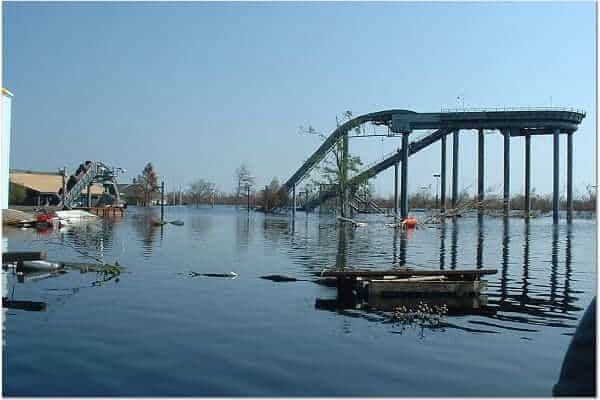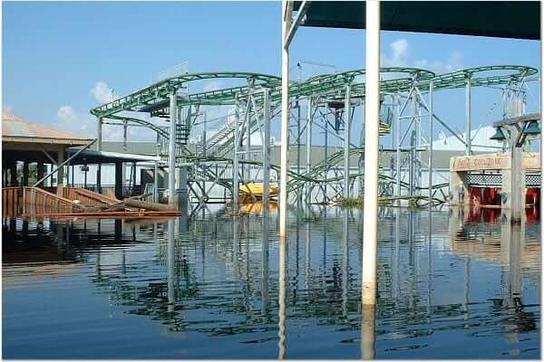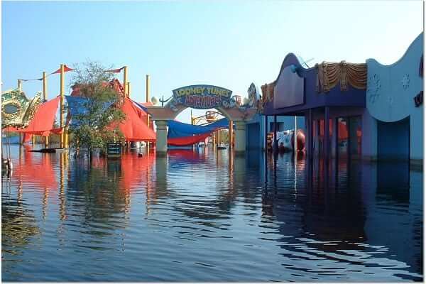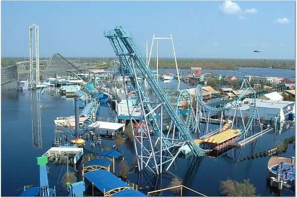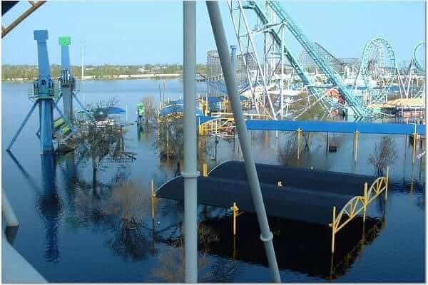 The entire park was submerged in up to seven feet of storm surge water resulting from the killer storm’s direct hit. Due to the low ground level of the park and the failure of storm pumps (no power), Six Flags New Orleans remained a flooded disaster for several weeks. Because of the water damage to all of the “flat rides” and all but one of the others the amusement park was forever closed.