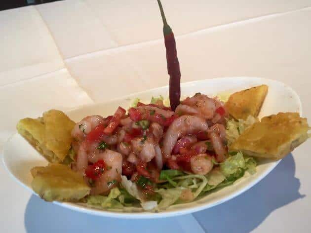 Fire Roasted Shrimp, Tomatillo, Lime, Avocado, Cucumbers, Tomato, Onion, Tostones (Gluten-Free) $15