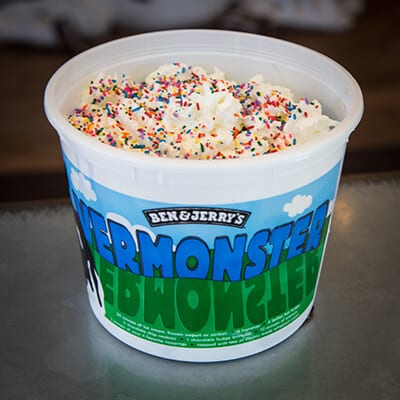 Ben & Jerry’s is famous for their fantastic flavors of ice cream. What many may not know is that they offer a monster of a frozen treat. The Vermonster starts with 20 scoops of your favorite flavors. Four whole bananas are sliced and added along with three cookies and a brownie. This is topped with hot fudge and/or caramel, ten spoonfuls of chopped nuts, two more spoons full of your favorite candy toppings and whipped cream.