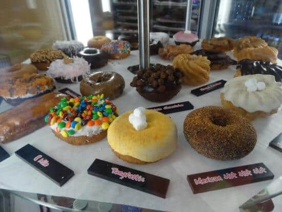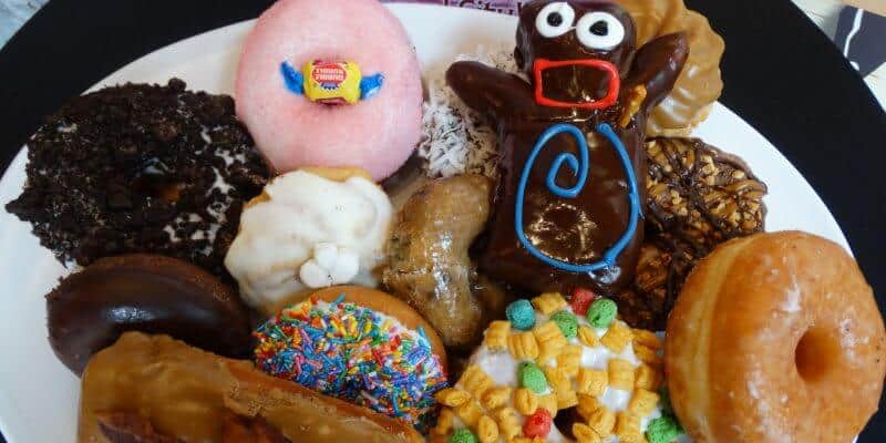 Voodoo Doughnut serves a range of sixty eclectic doughnut flavors, including Grape Ape, Mango Tango, the Voodoo BubbleBacon Maple Bar, and the Hollywood Cream, created especially for Universal CityWalk.