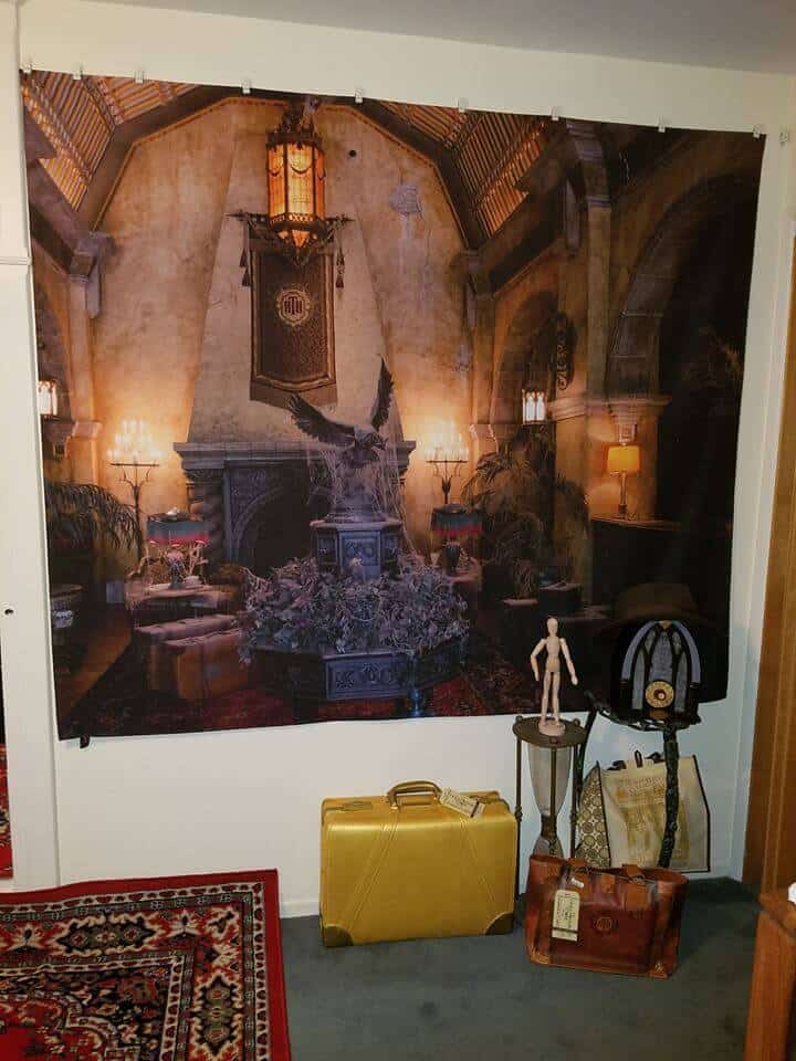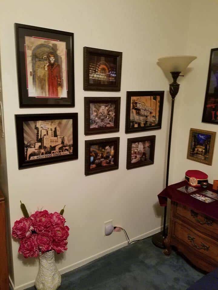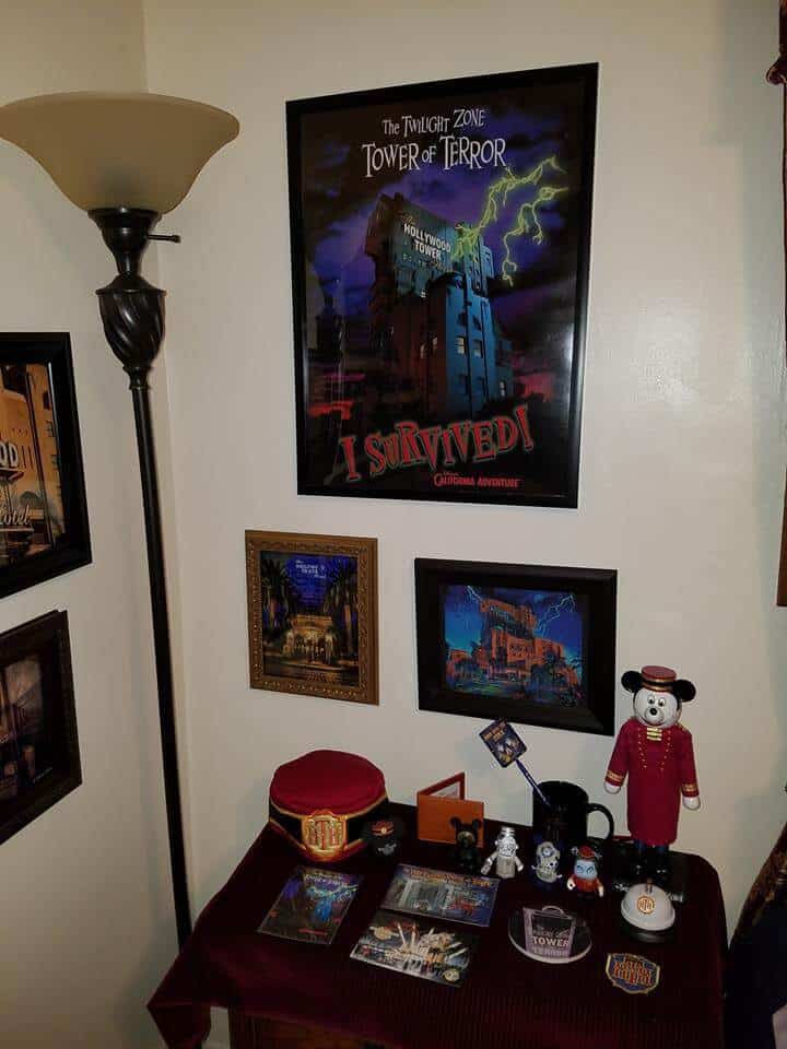 For the Tower of Terror room, David turned to artist Topher Adams to help out. Wanting to make his newly acquired Hollywood Tower Hotel bellhop costume feel at home, David petitioned Adams for a backdrop depicting the haunted maintenance elevator doors. Once acquired, the eerie elevator exceeded expectations and another piece from Adams depicting the Tower’s hotel lobby was added to David’s collection.
