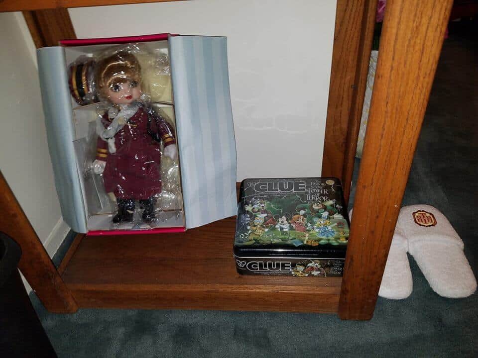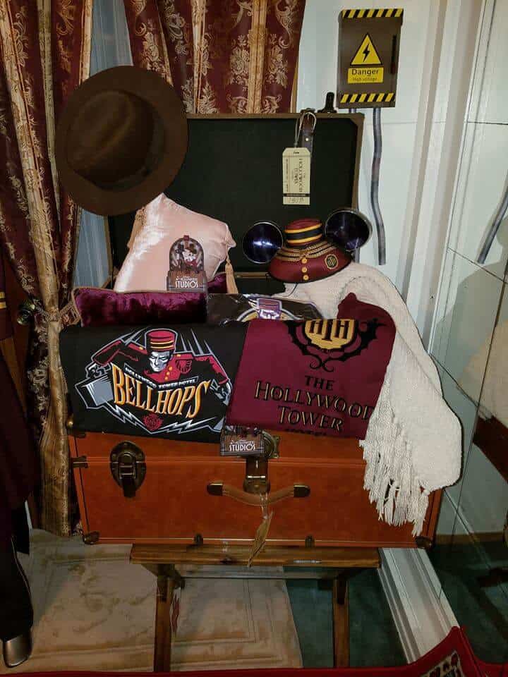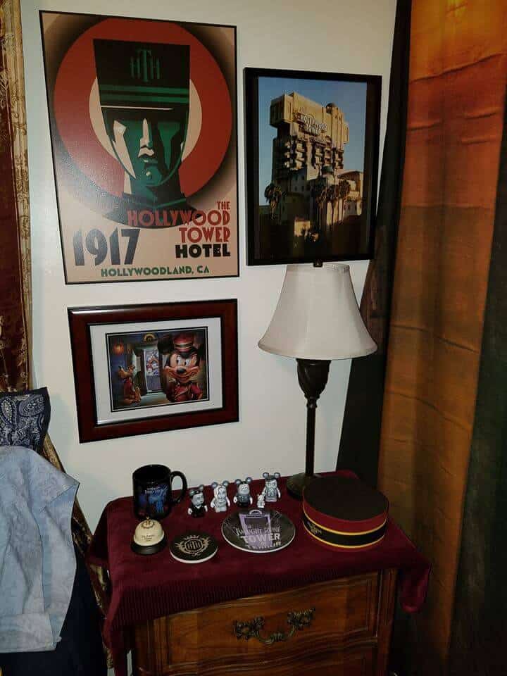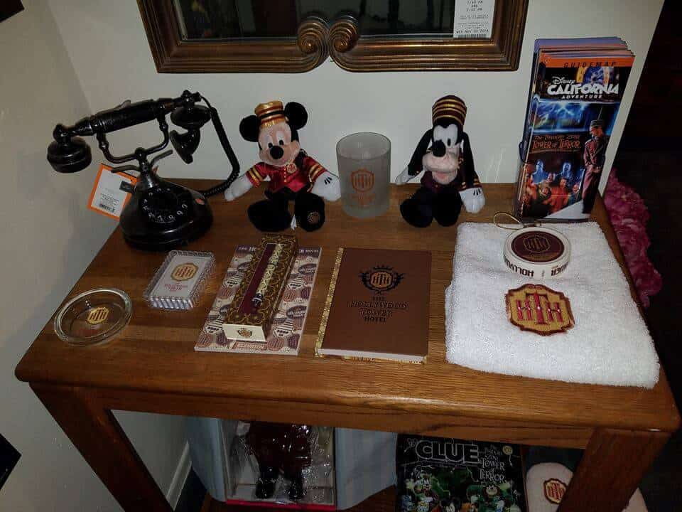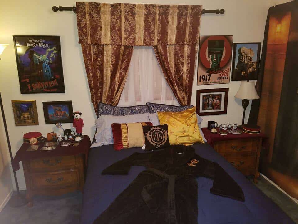 Observe, if you will, the various Hollywood Tower Hotel (HTH) finery found in this Twilight Zone Tower of Terror themed room. Here you’ll find a full bellhop costume, an HTH bathrobe, slippers and pillow. Scenes and posters from the ill-fated hotel hang on the walls while various hotel memorabilia can be seen around the room.