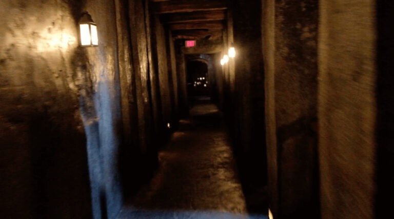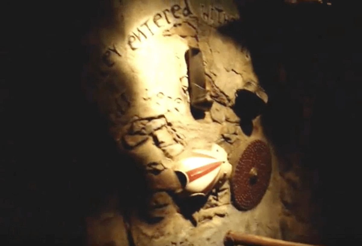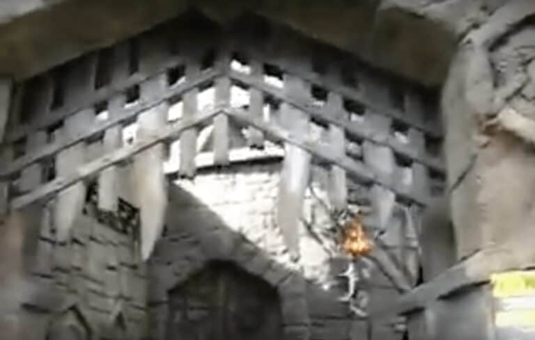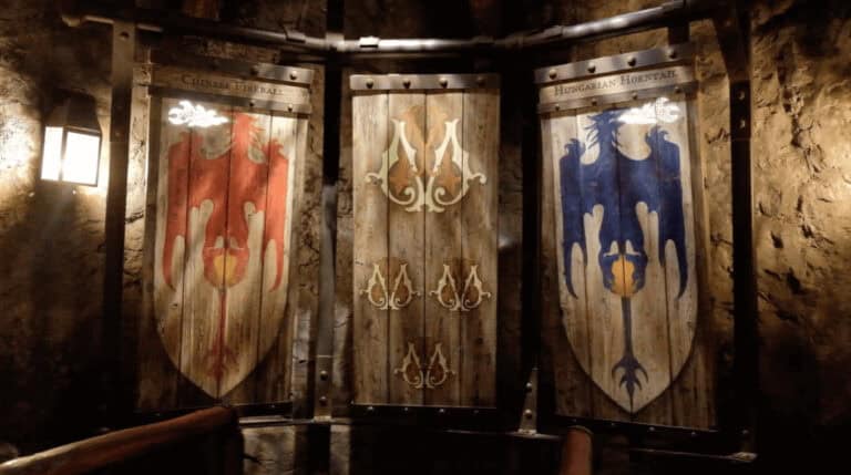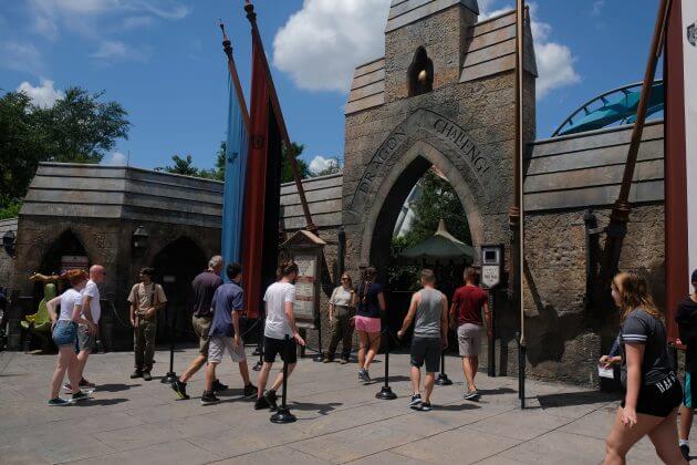Prior to the Harry Potter re-themeing of the queue, it was the set of a ruined castle where the Fire and Ice dragons lived. In this old queue guests would pass through dungeons with human skeletons, cobwebs and torches.