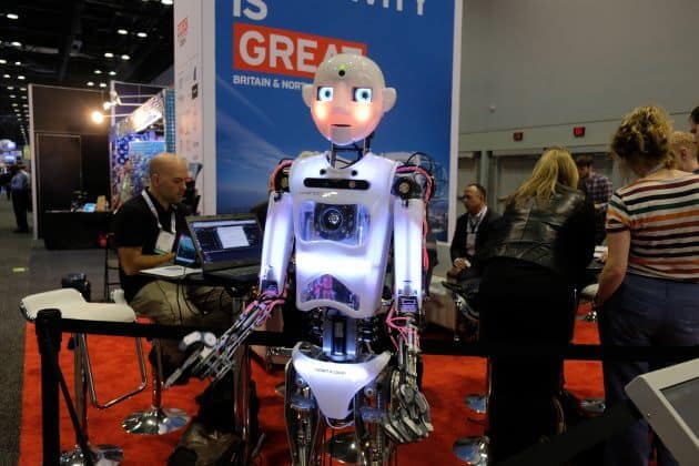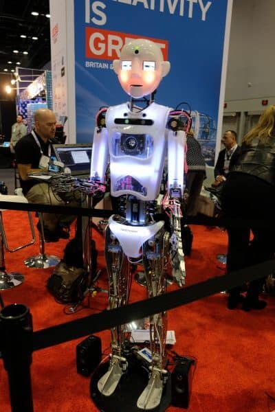 Robothespian was one of the more interactive displays at the convention as this robot would actually talk back to you as you spoke with it. Created by Engineered Arts, Robothespian is designed to immediately start talking with prerecorded phrases when someone walks into its view. The robot is also capable of analyzing faces for age, gender and emotion, and responding accordingly. During the presentation, a member of the company was in the U.K. talking through the robot and interacting with guests to the booth.