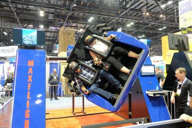Guests walking around the show floor were surrounded by different VR experiences, one of the more classic ones offered was the MaxFlight simulator. You may have seen something similar to this in a shopping mall or other small carnival. Visitors who took on this experience got to fly a virtual plane over a small island. A fun part of this simulator is the fact that it does complete inversions and twists, making for a wild ride.