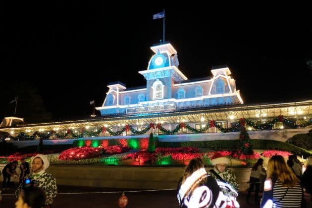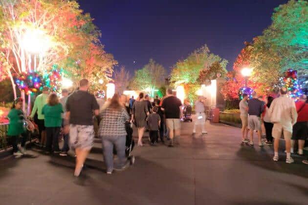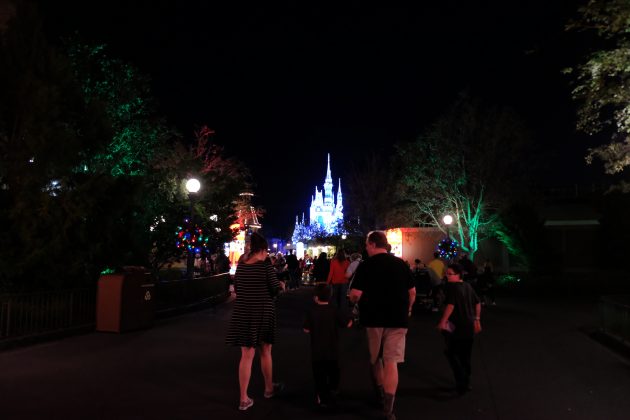 After receiving your first treat of the night, you are transported into the holiday event. The first view you’ll see as you enter is the Cinderella Castle beautifully lit with Christmas lights. The lights from the castle are so bright, you can actually see them from the ferry dock at the ticket center.