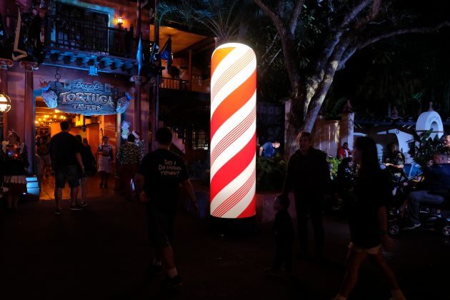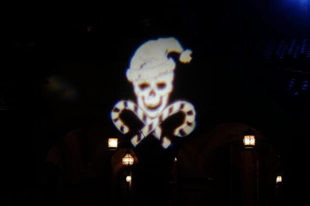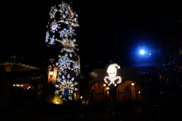 Besides the awesome shows featured above, the event also includes holiday projections around the park. The skull and candy canes pictured below were projected onto the Pirates of The Caribbean attraction to fit in theme with the ride.