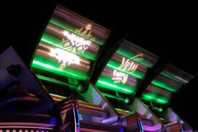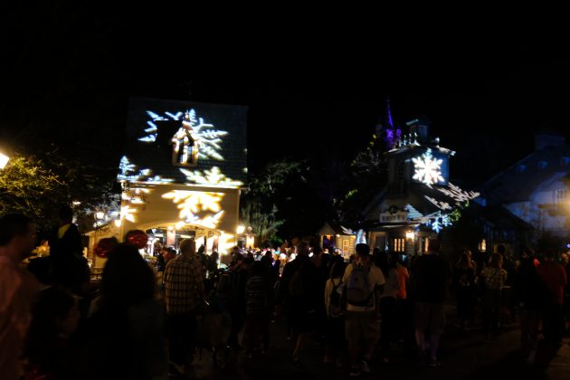 Snowflakes are a popular projection found throughout the park. Another is a projection reading “Mickey’s Very Merry Christmas Party,” which is projected in every land and at the very front of the park.
