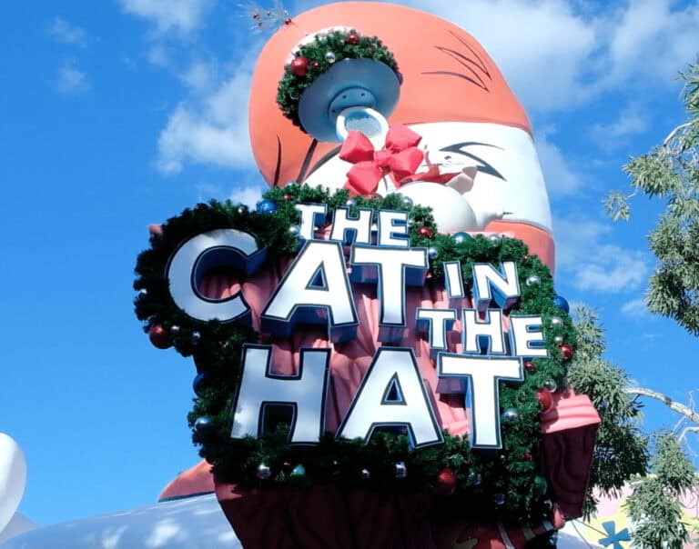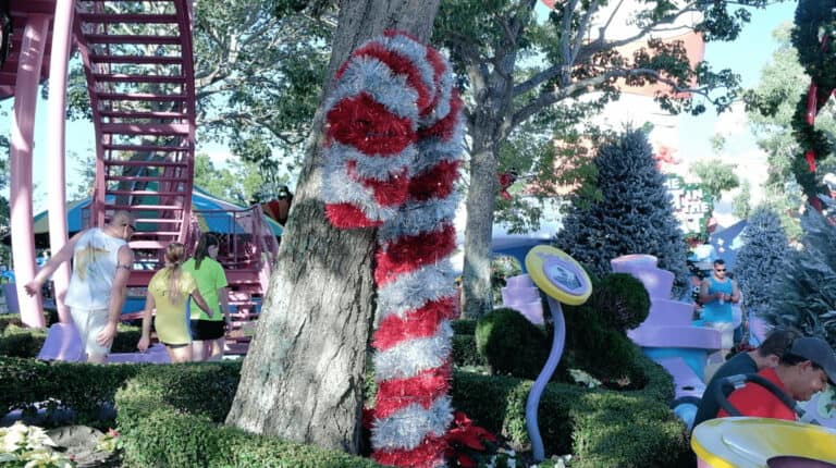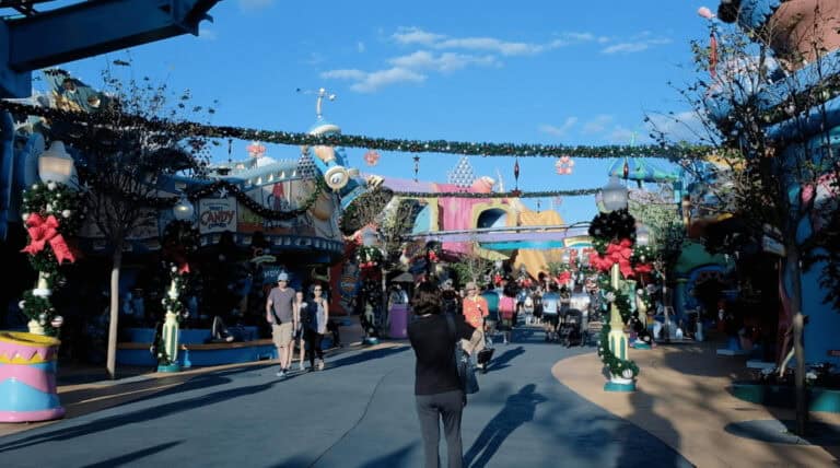 The popular land is a staple of Islands of Adventure, featuring several Seuss-themed attractions and everyone’s favorite Green Eggs and Ham Cafe. And now with the coming of the holidays, the land is a winter wonderland. The Dr. Seuss themed area is jam packed full of different Christmas decorations, including Christmas trees, garland decorated with balls, wreaths, lights and many other holiday themed ornaments.