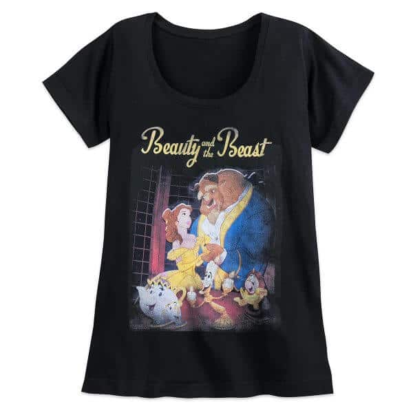 Take style inspiration from the VHS cover of Disney’s “Beauty and the Beast” with this retro T-Shirt ($26.95). The jersey knit tee features distressed screen art of Belle, Beast, Lumiere, Cogsworth, Mrs. Potts, and Chip with “Beauty and the Beast” text. Just like the movie, this t-shirt is a timeless classic.