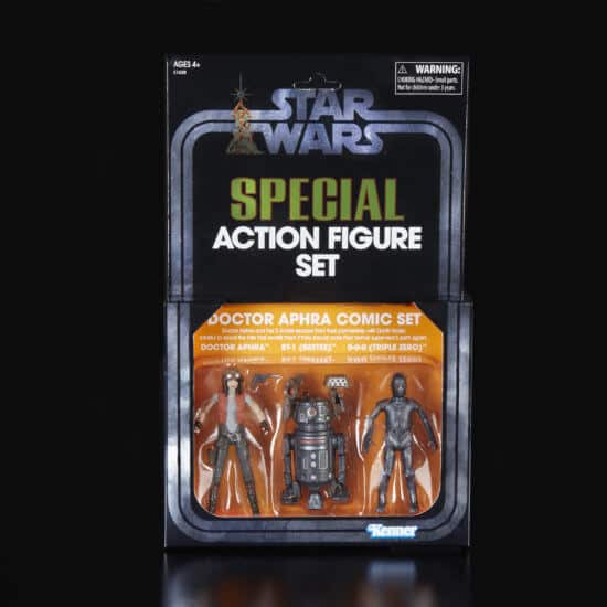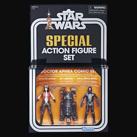 “Celebrate the legacy of STAR WARS with premium, highly-detailed 3.75-inch scale figures and vehicles from THE VINTAGE COLLECTION! Imagine the adventures of the STAR WARS comic universe with these 3.75-inch-scale DOCTOR APHRA, 0-0-0 (TRIPLE ZERO), and BT-1 (BEETEE) figures that feature premium deco across multiple points of articulation and design inspired by the DOCTOR APHRA comics. Includes 3 figures and 3 accessories.”
