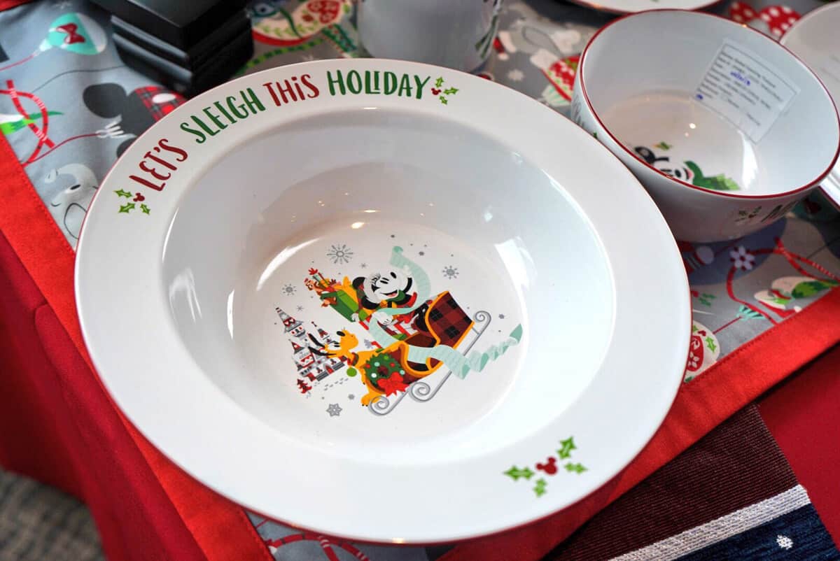 Now let’s take a look at some new holiday-themed white-ware tableware including dinner plates, salad plates, bowls and a serving tray. The pieces are designed to have a white base to match most holiday-themed serving platters and feature different graphics of Mickey, Minnie, Goofy, and Donald Duck engaging in different holiday activities.