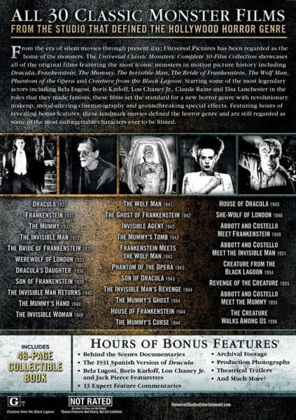 This latest collection creeps in with just over 40 hours of eerie entertainment. Universal Studios Classic Monsters Complete 30-Film Collection includes all of the studio’s finest fear films released from 1931-1956.