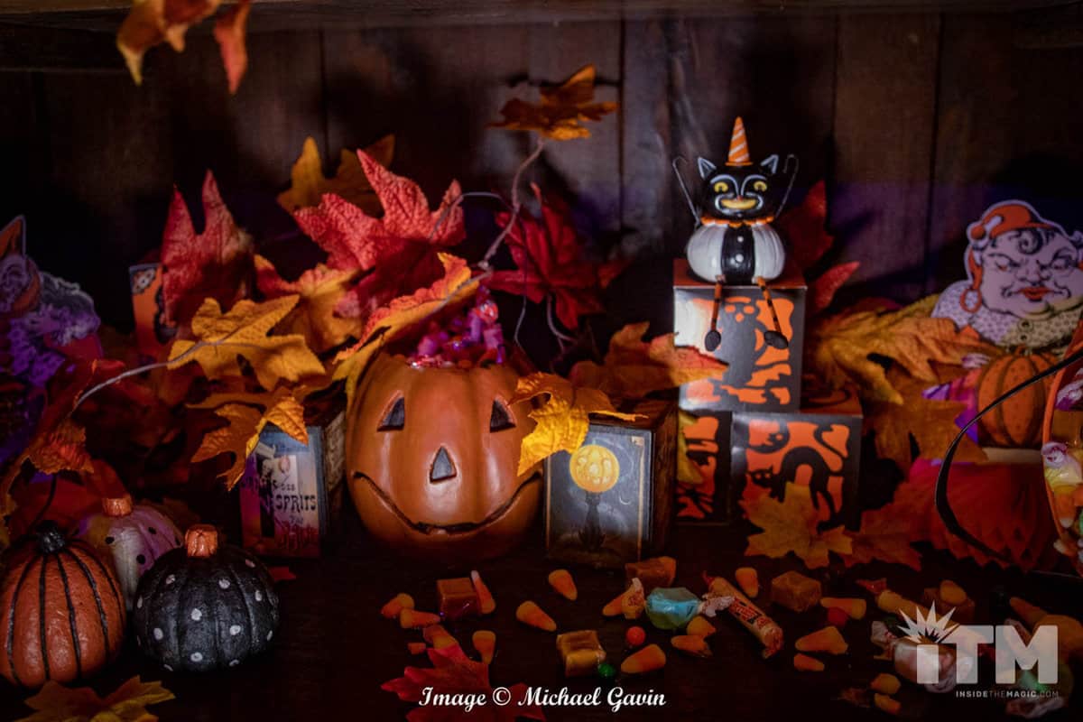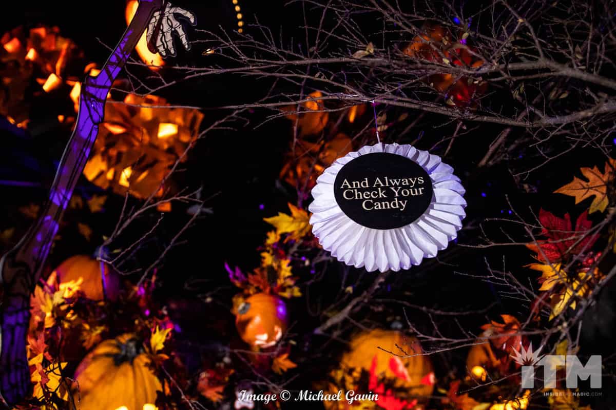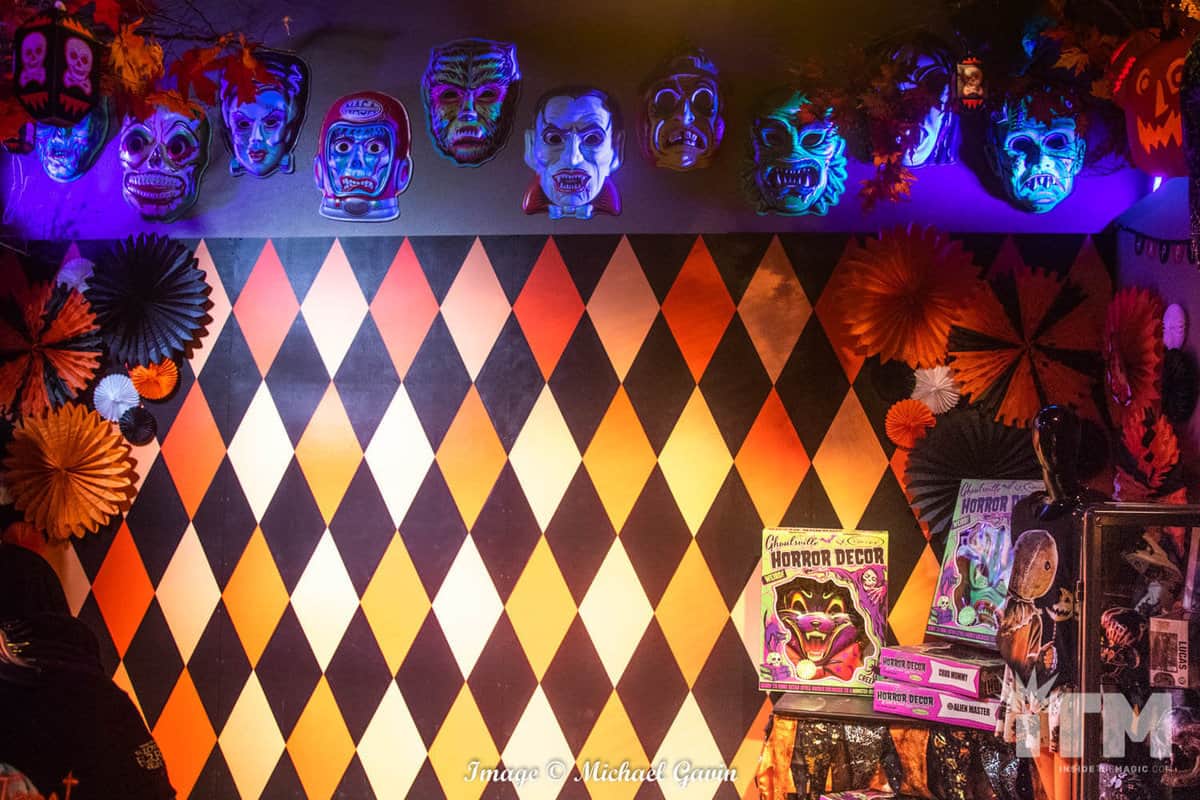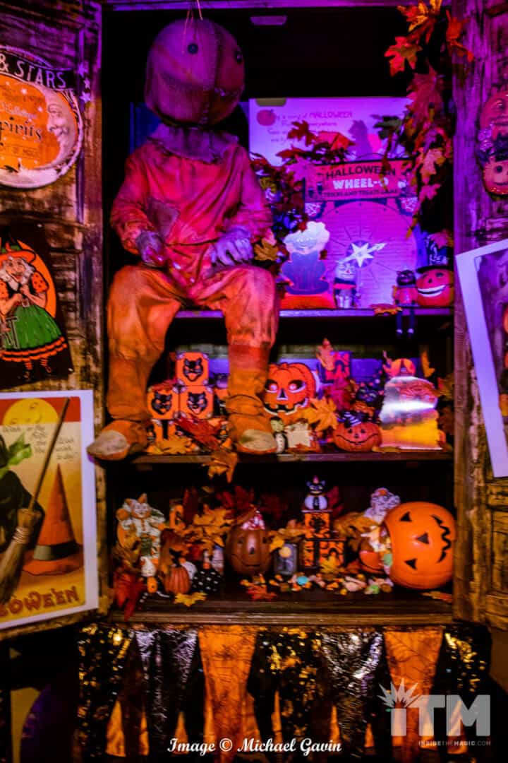 Upon entering, visitors are immediately immersed within the treasures and traditions of Halloween. “Trick ‘r Treat” rules this roost. Oversized costume masks, glowing jack-o-lanterns, nostalgic signs of the season; classic, colorful walls and banners; and scores of yellow, orange and brown leaves invoke an amazing ambiance of Autumn. Rules of Halloween, hidden among the fall foliage, warn of traditions to be followed for this spooky season (or pay the price). Of course, Sam makes a couple of appearances, too!