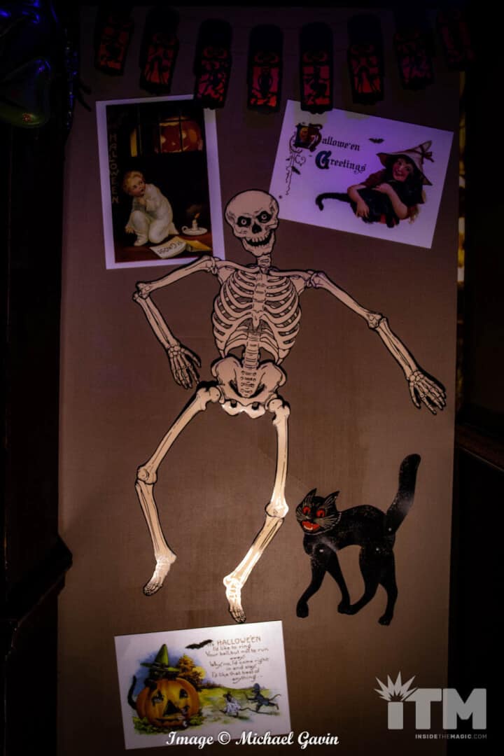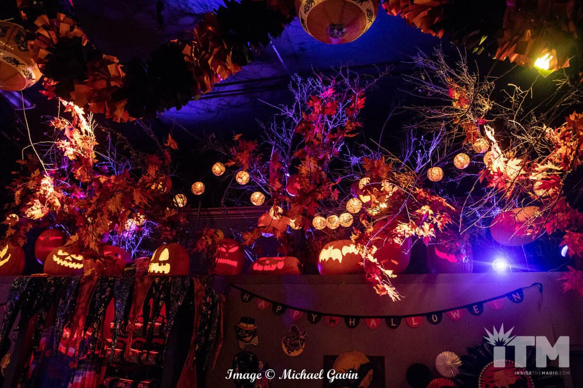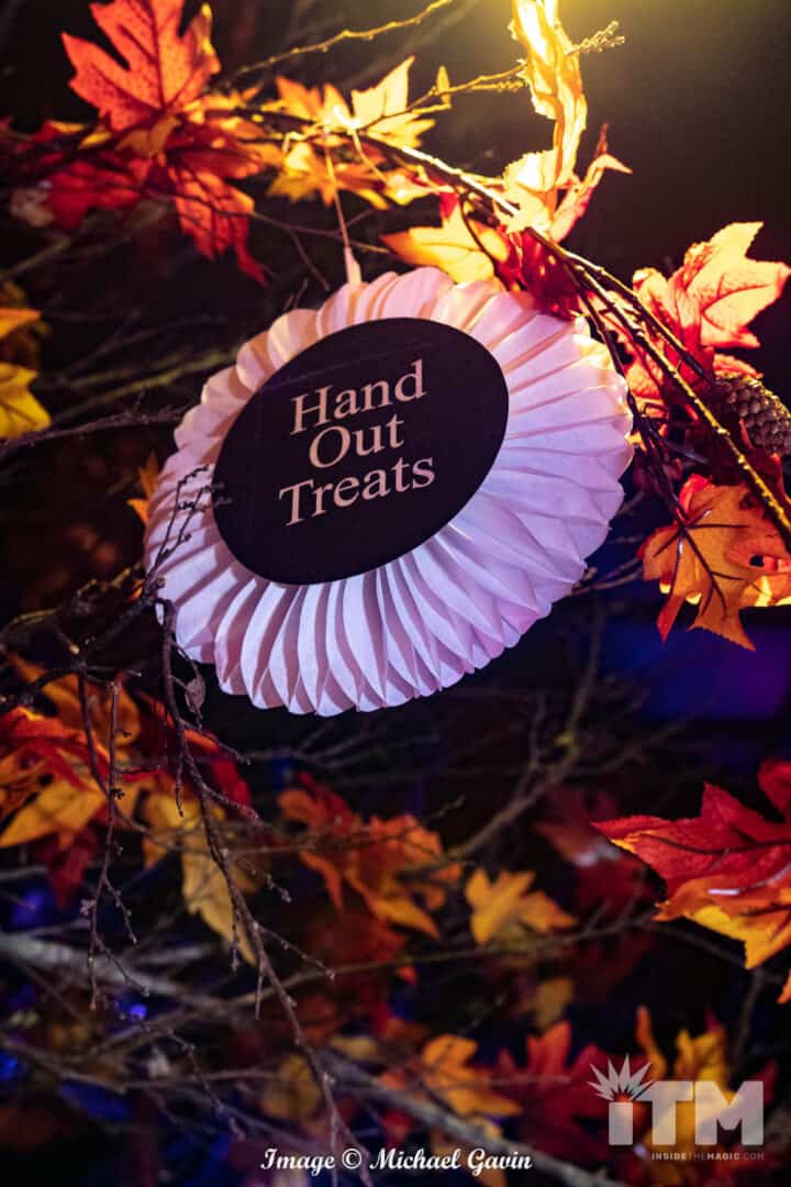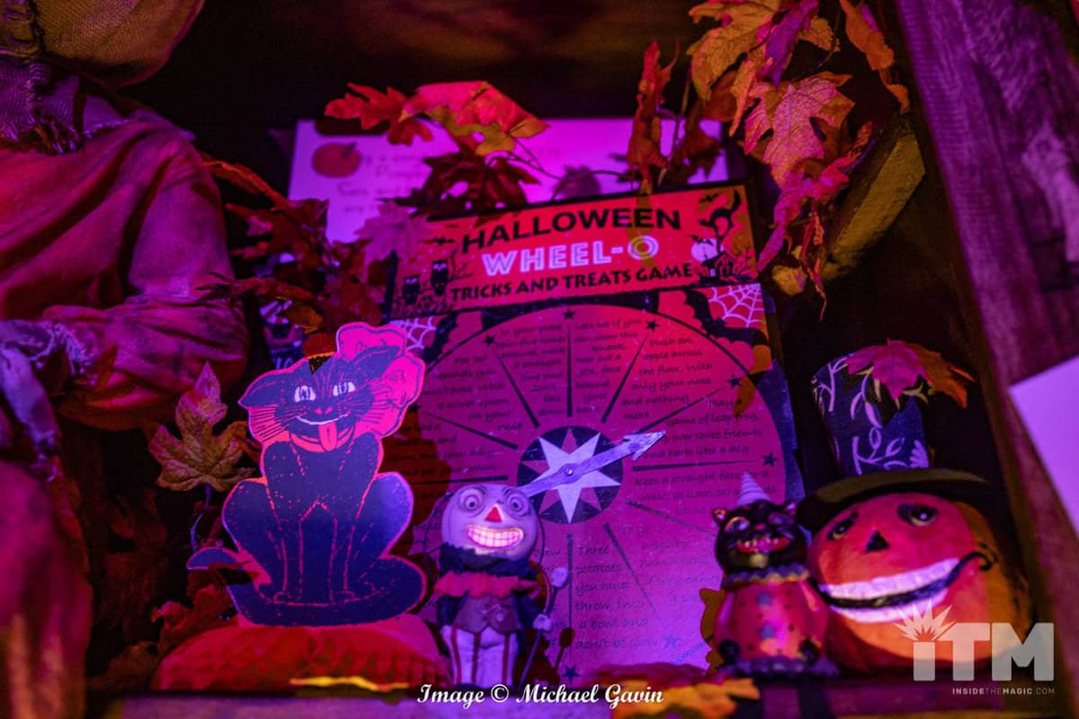 Upon entering, visitors are immediately immersed within the treasures and traditions of Halloween. “Trick ‘r Treat” rules this roost. Oversized costume masks, glowing jack-o-lanterns, nostalgic signs of the season; classic, colorful walls and banners; and scores of yellow, orange and brown leaves invoke an amazing ambiance of Autumn. Rules of Halloween, hidden among the fall foliage, warn of traditions to be followed for this spooky season (or pay the price). Of course, Sam makes a couple of appearances, too!