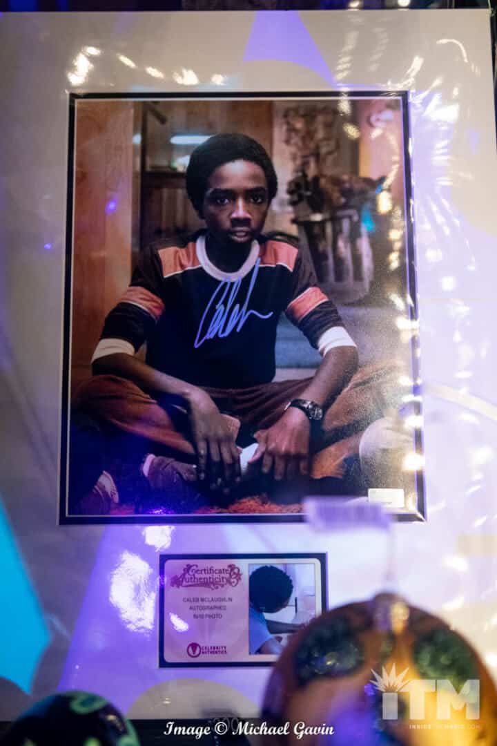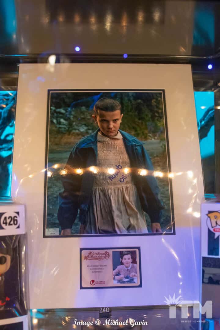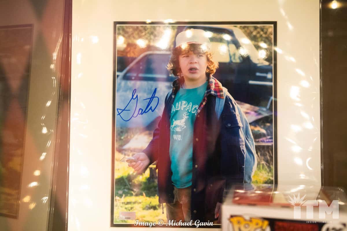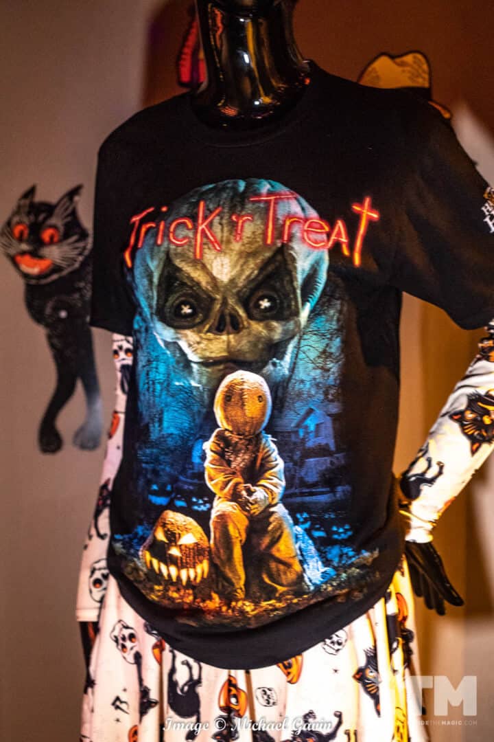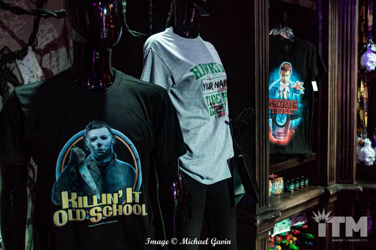 At the back of this Halloween haven, a portal to an upside-down realm awaits. Tribute Store’s second section,“Stranger Things,” features a sinister side of Hawkins. Clad in a bright yellow hazmat suit, a single sentinel greets guests who enter this eerie experience. His attire, a testament to the attention to detail in this spooky shop, is screen accurate (right down to the equipment labels). Autographed cast photos, custom made tee shirts, and event merchandise tempts shoppers. Registers for the entire store are located along the perimeter fence to Hawkins National Laboratory (near the shop’s exit).