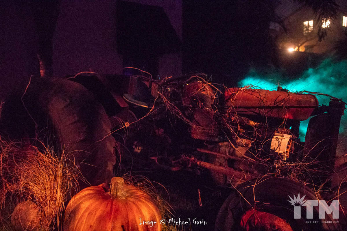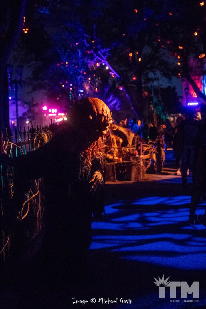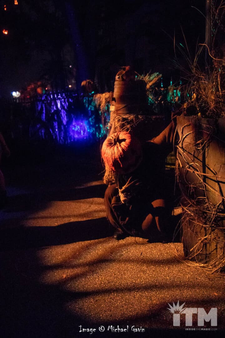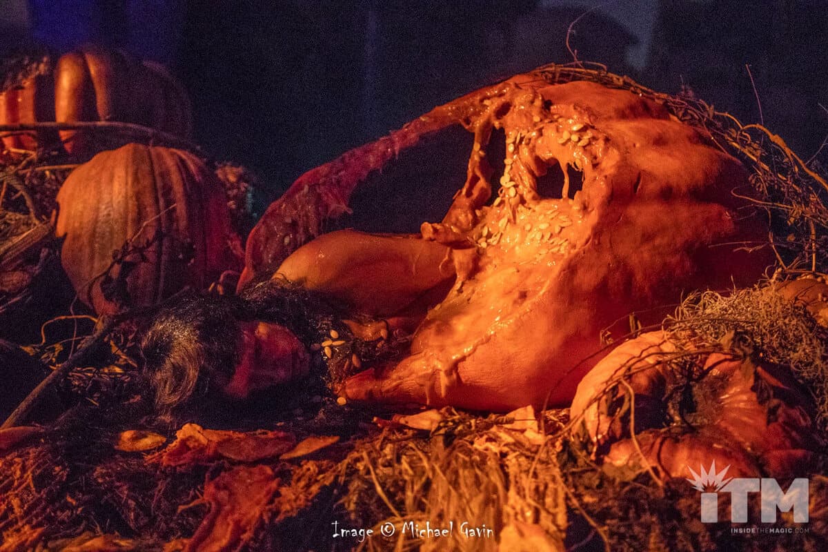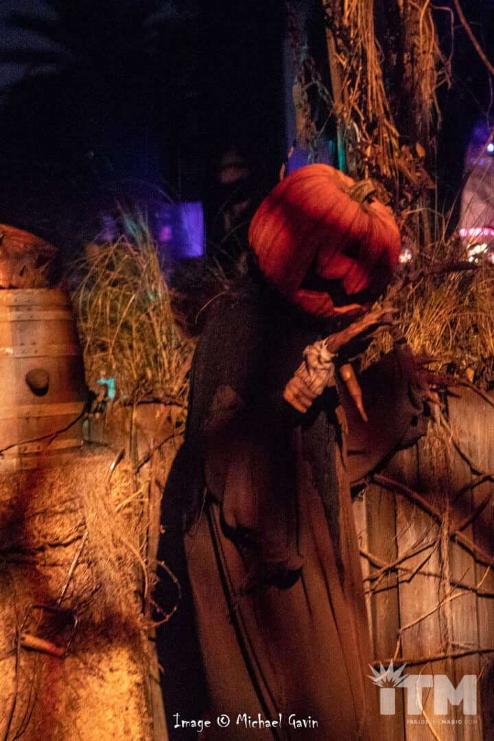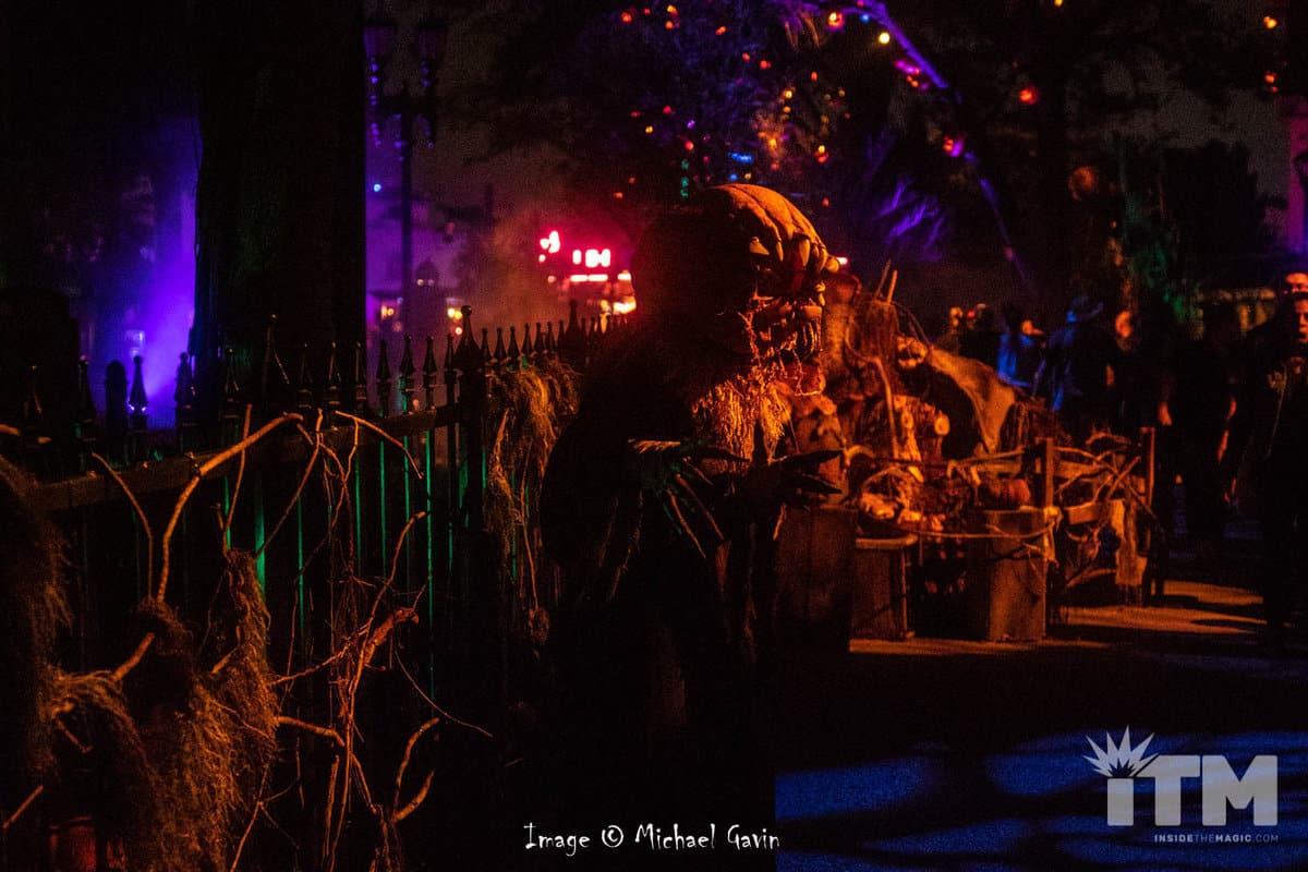 With mild scares and seeming much like macabre advertisements for HHN’s haunted houses, something sinister stirs in the straw of this “barn.” Prop powered signs serve as perfect photo opportunities for favored fear mazes and as distractions allowing the hay covered creatures and giant gourd topped monsters to “attack” their prey.