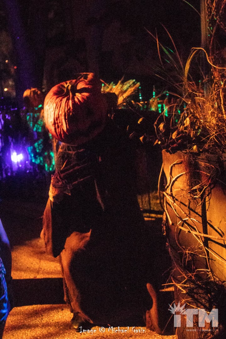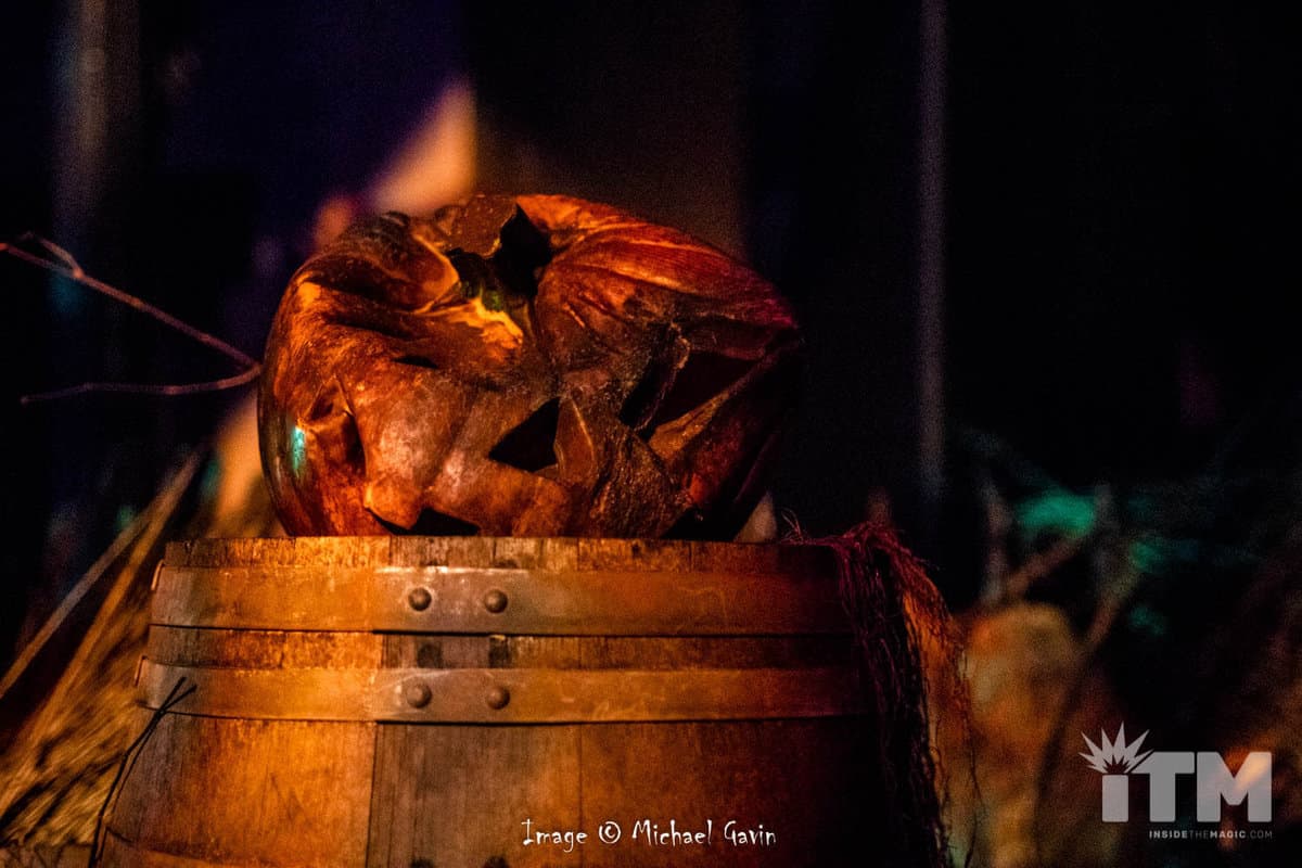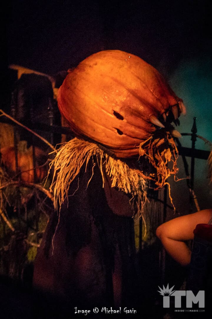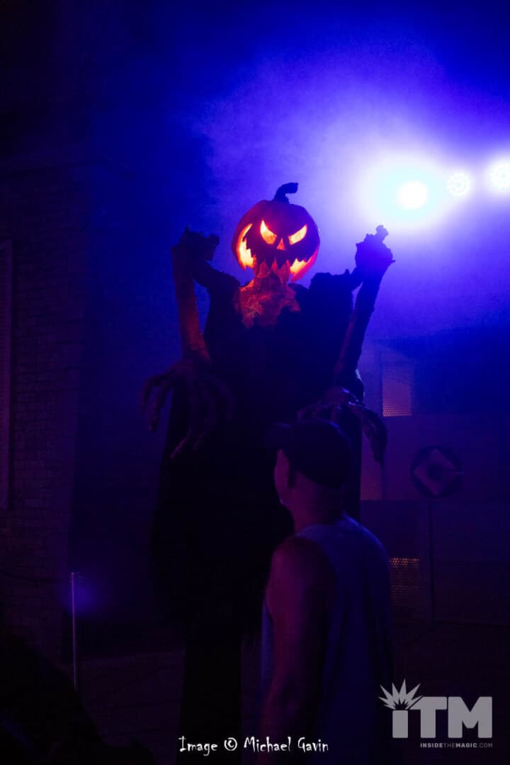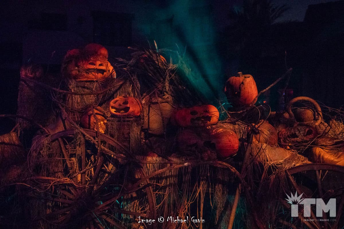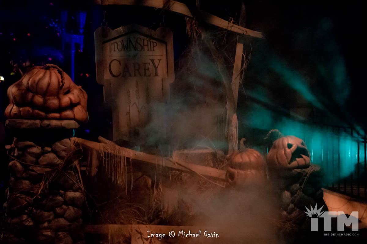 With mild scares and seeming much like macabre advertisements for HHN’s haunted houses, something sinister stirs in the straw of this “barn.” Prop powered signs serve as perfect photo opportunities for favored fear mazes and as distractions allowing the hay covered creatures and giant gourd topped monsters to “attack” their prey.