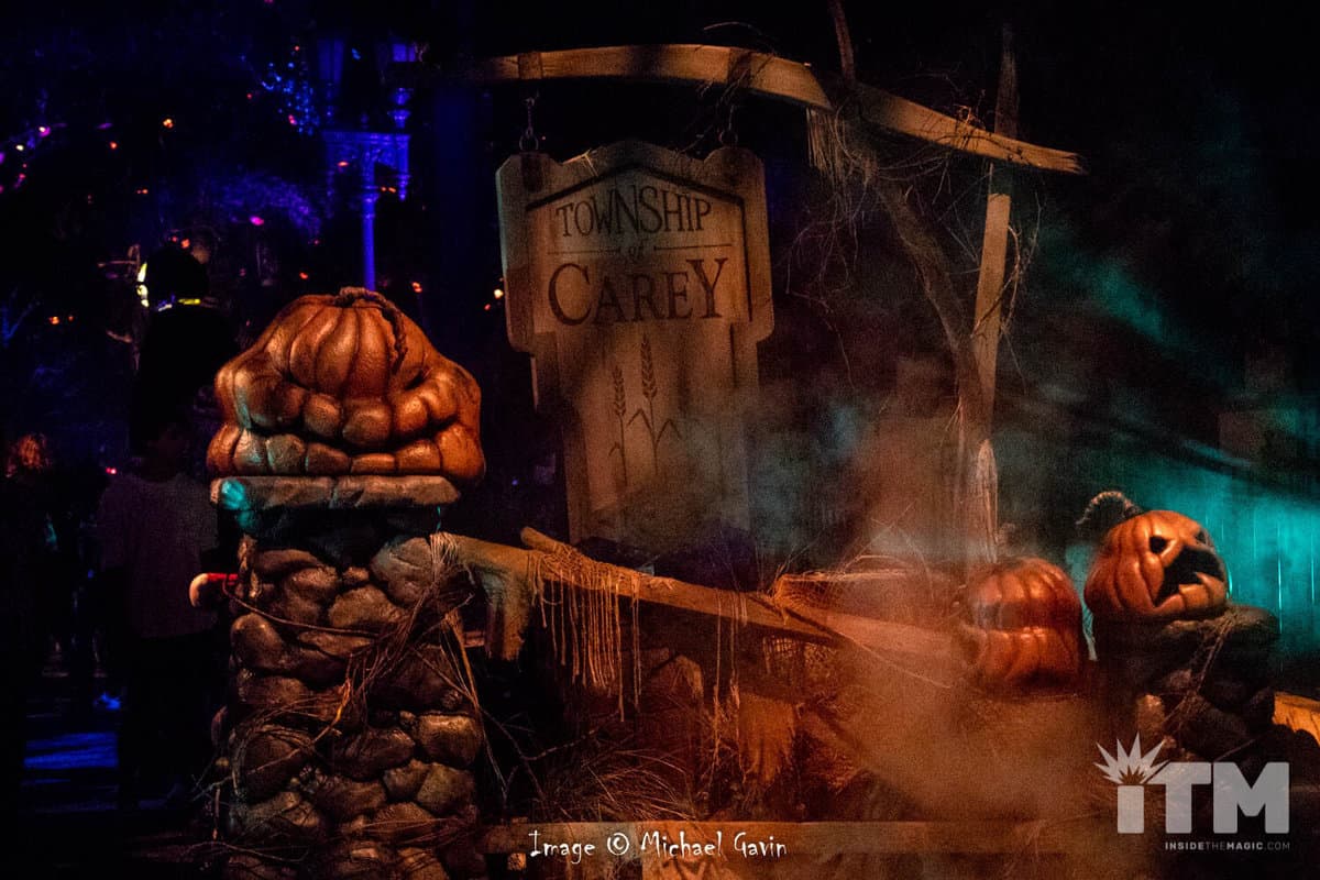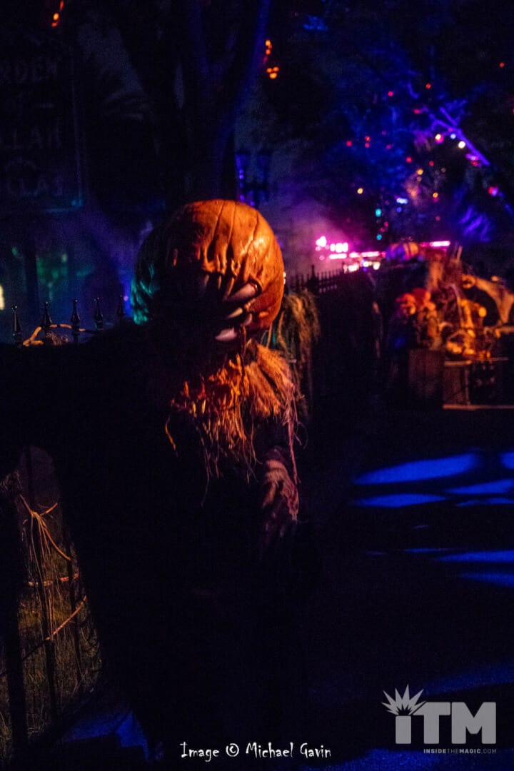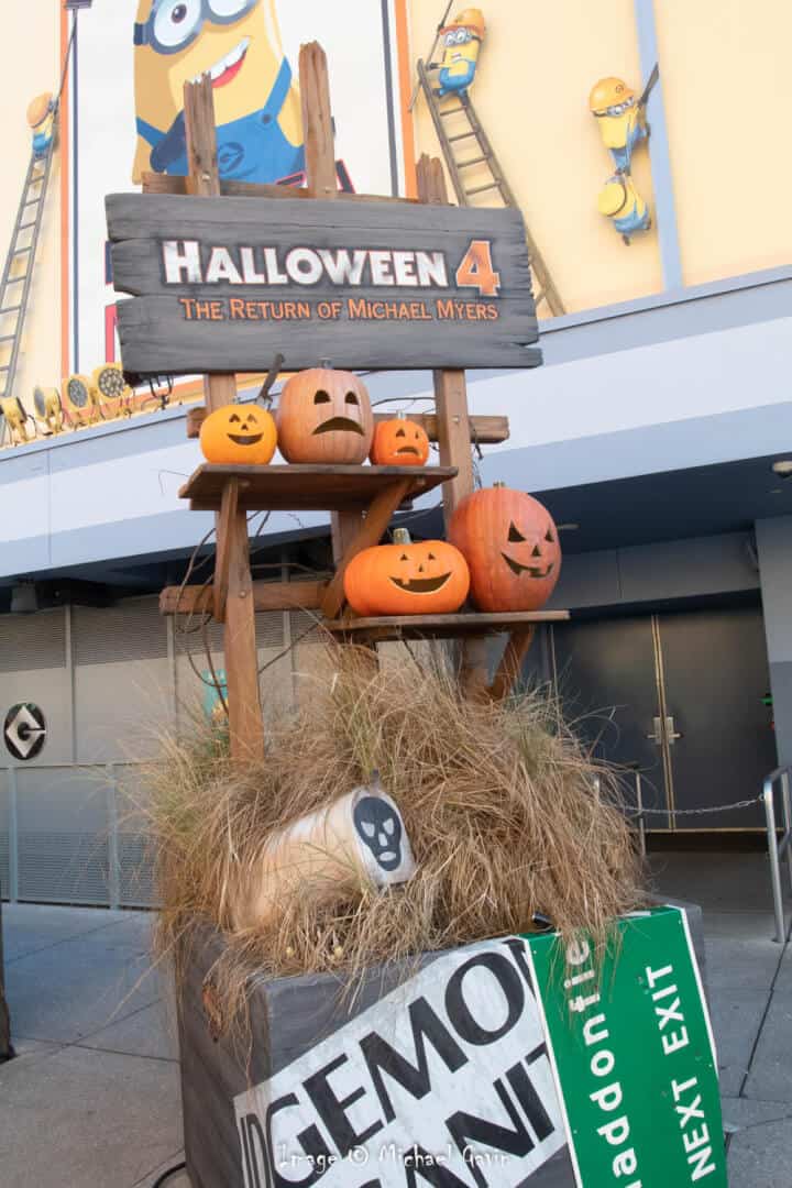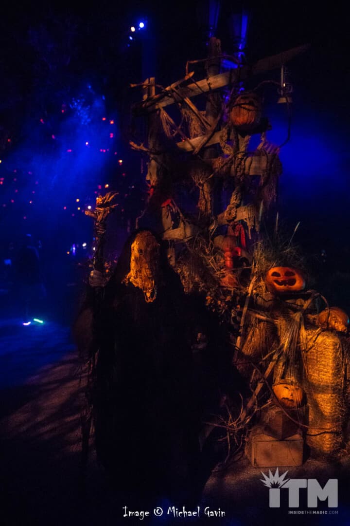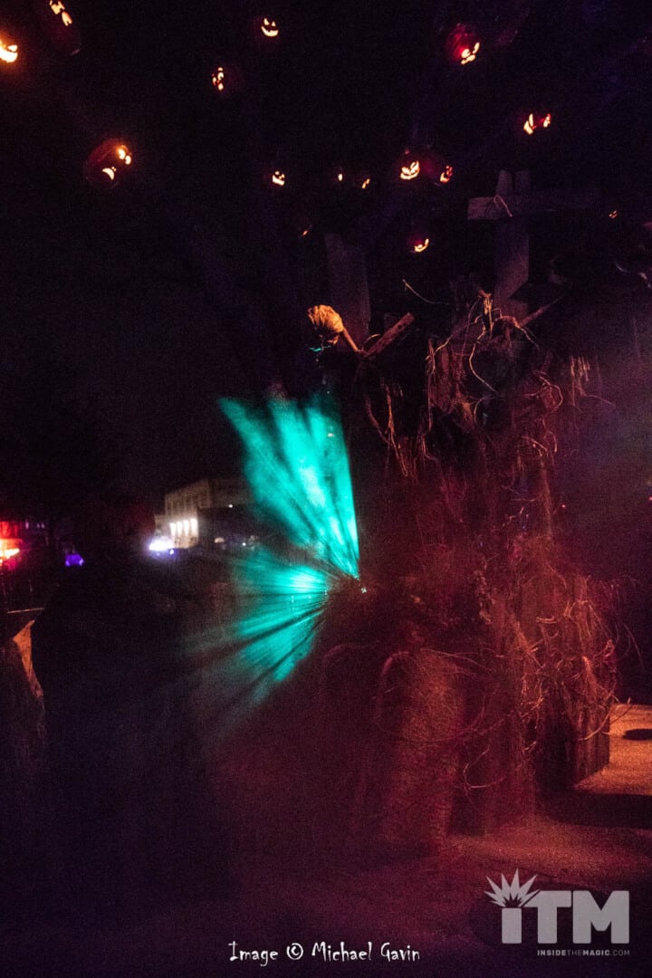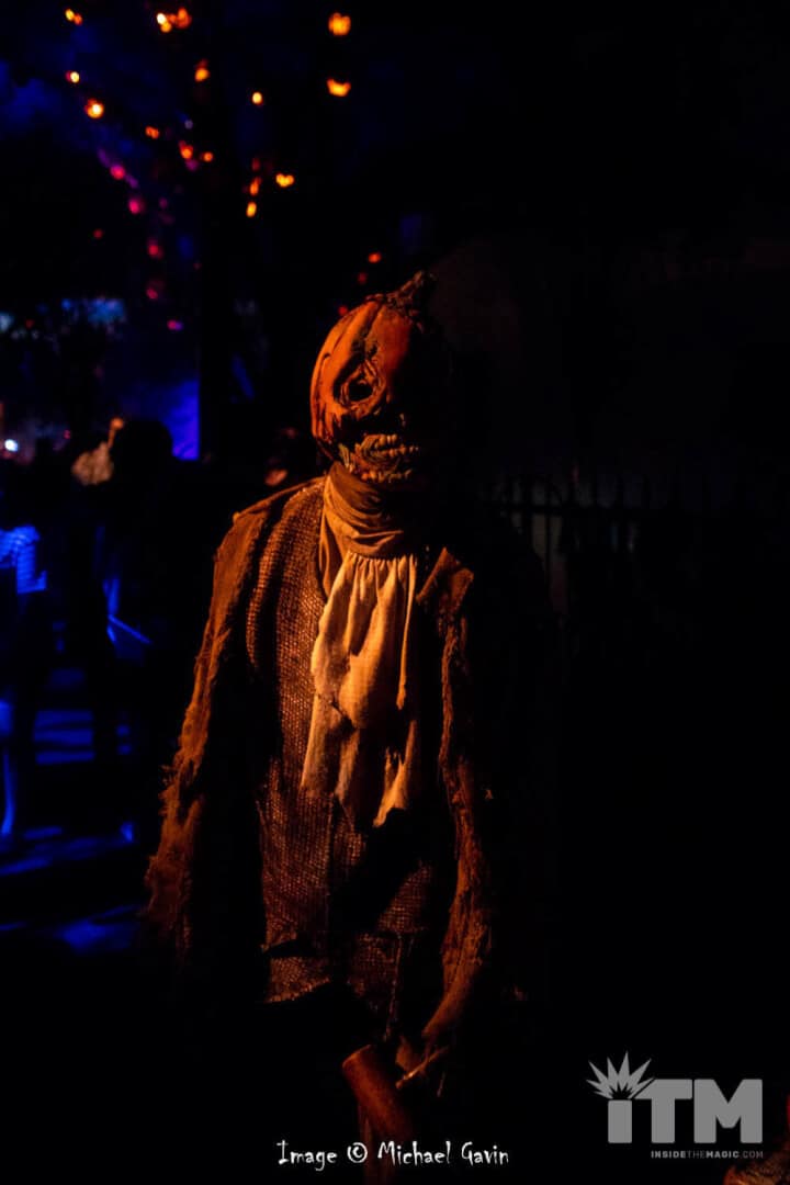 With mild scares and seeming much like macabre advertisements for HHN’s haunted houses, something sinister stirs in the straw of this “barn.” Prop powered signs serve as perfect photo opportunities for favored fear mazes and as distractions allowing the hay covered creatures and giant gourd topped monsters to “attack” their prey.