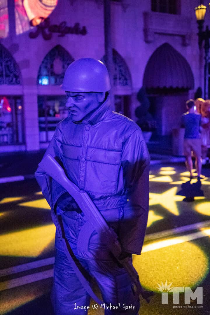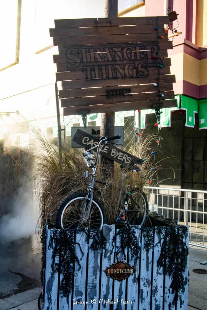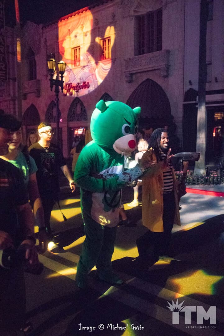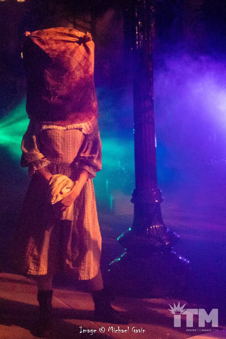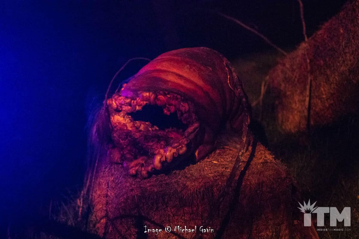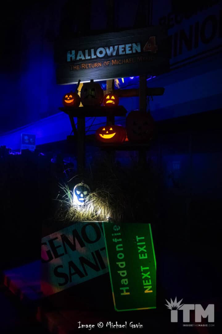 With mild scares and seeming much like macabre advertisements for HHN’s haunted houses, something sinister stirs in the straw of this “barn.” Prop powered signs serve as perfect photo opportunities for favored fear mazes and as distractions allowing the hay covered creatures and giant gourd topped monsters to “attack” their prey.