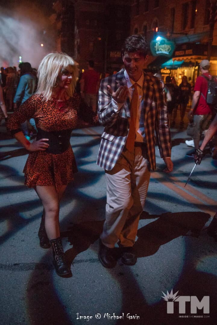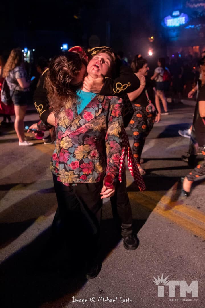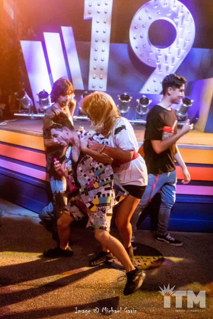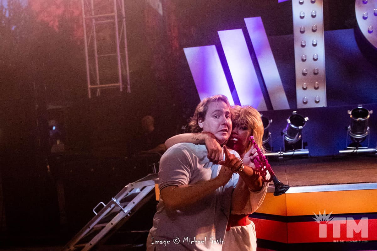 Partiers become prey as “innocent” guests appear to be randomly ravaged during the course of the evening. Emcee encouraged dance spotlights (featuring volunteers from the HHN audience), choreographed musical numbers and countdown to midnight are all “documented” by two unfortunate reporters from the local news.