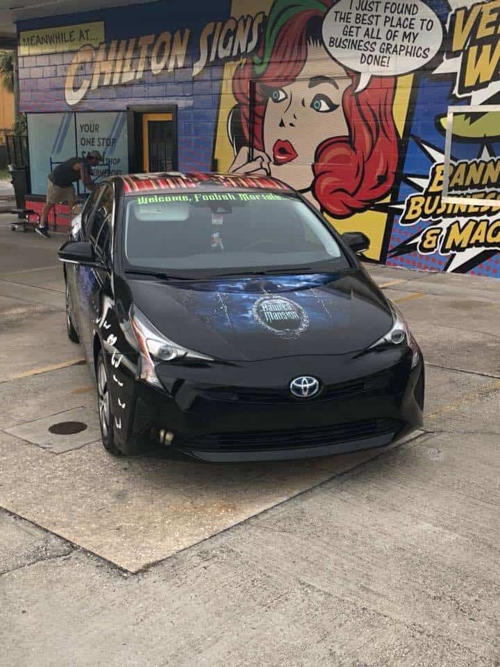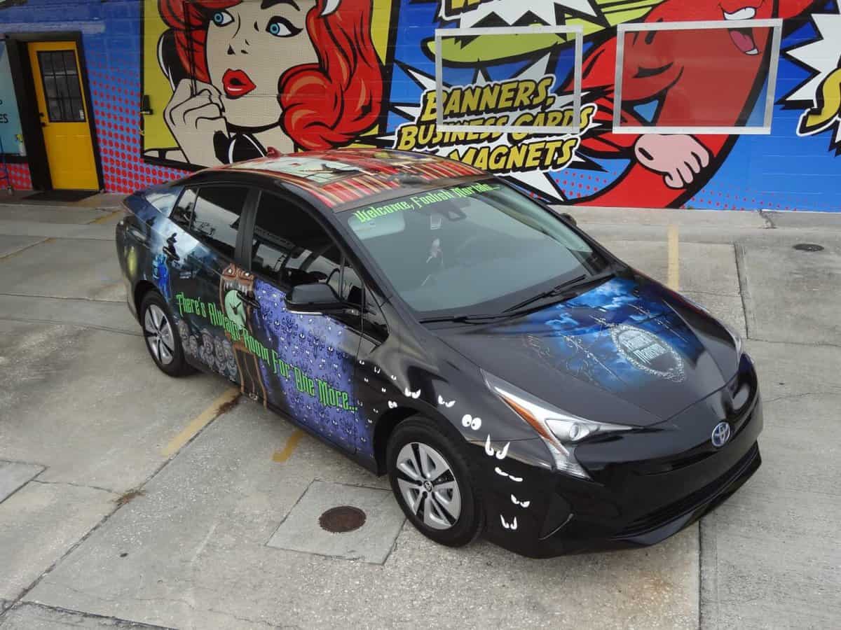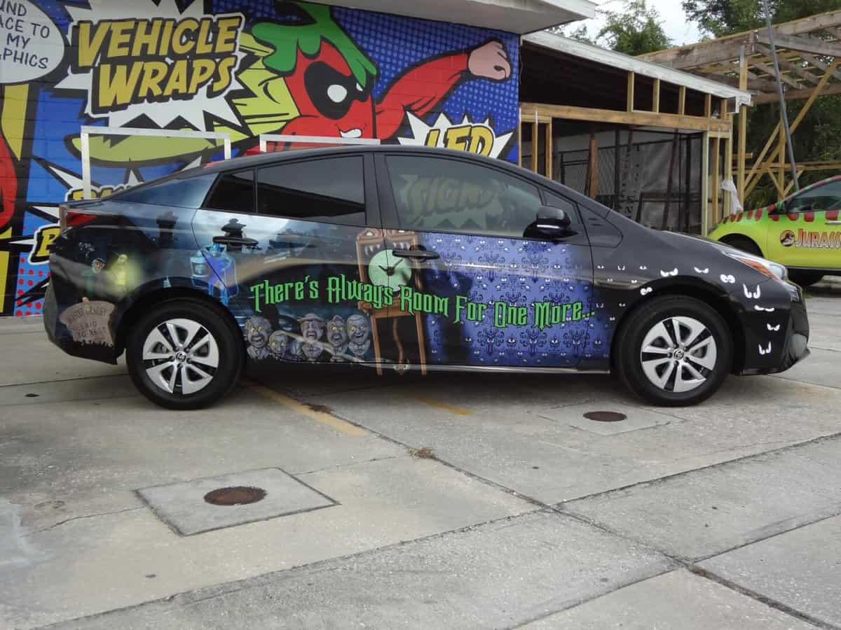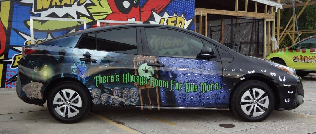 This black Toyota carries a Haunted Mansion logo on its hood. Disembodied eyes curve around the front quarter panels. These morph into the attraction’s infamous wallpaper.