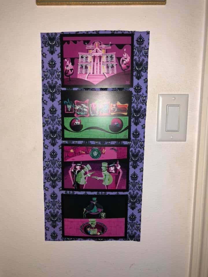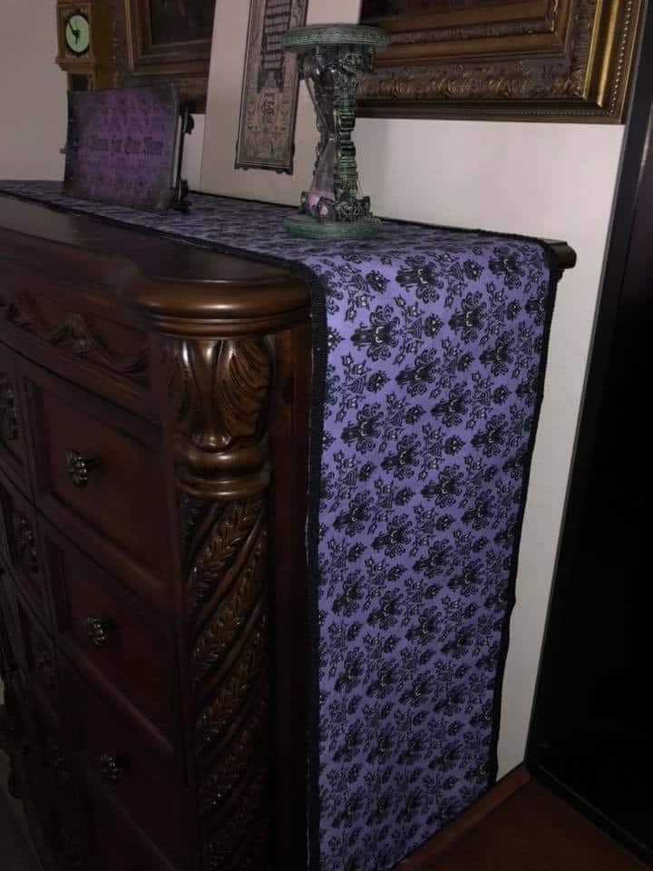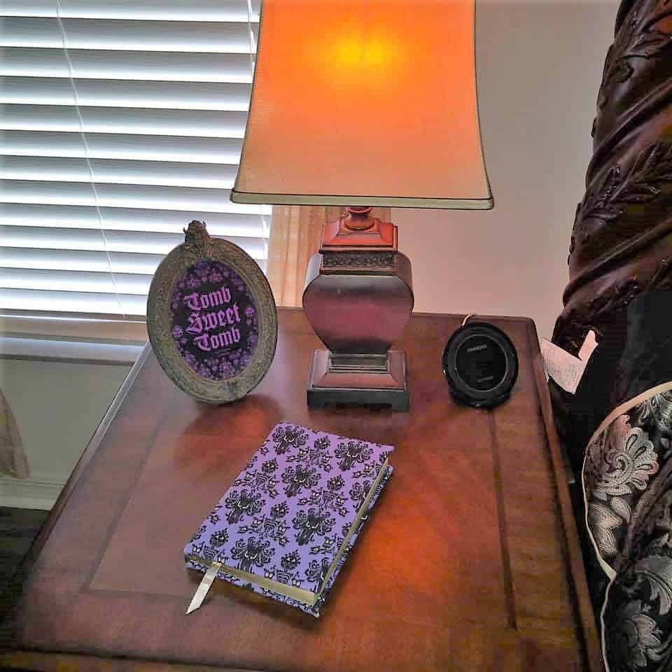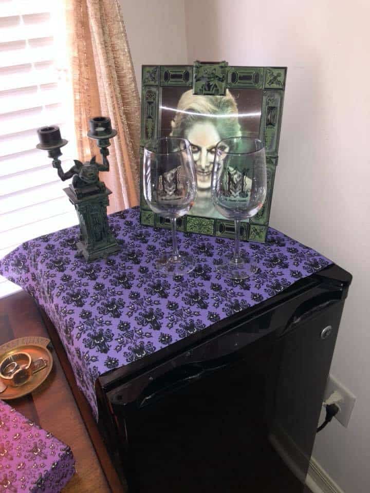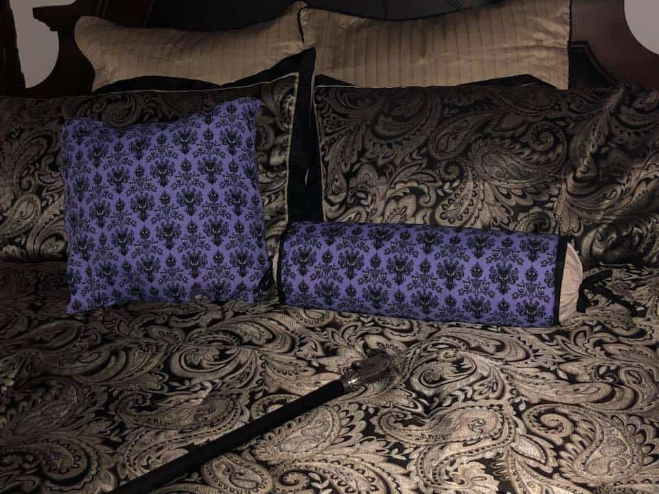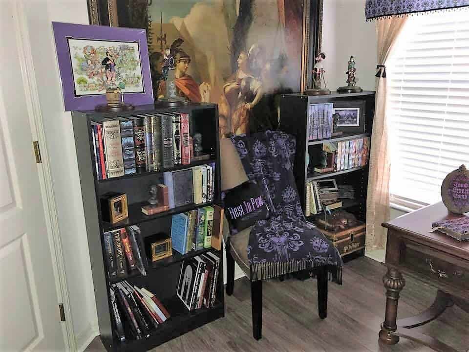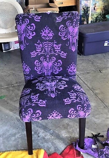 “Another of my favorite pieces in the bedroom is the upholstered chair that I made. At one time they were selling Haunted Mansion Chairs at the Disney Co-Op at Disney springs but they were a little bit out of my price range. So, I bought the Haunted Mansion throw blanket and used it to make my own” – Rita De La Torre