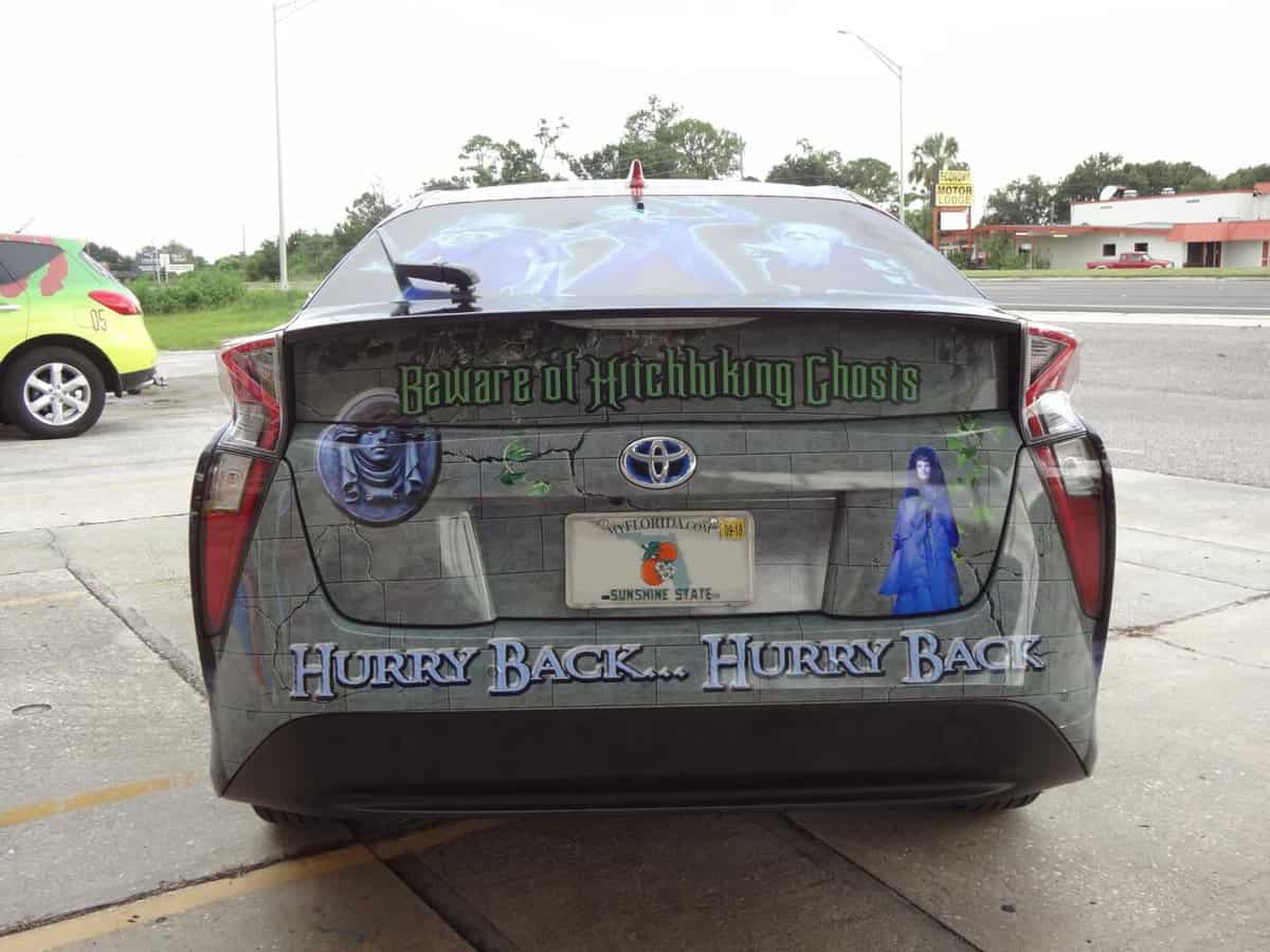 Certainly, fans of the Haunted Mansion will recognize several familiar phrases found around the automobile. On the front windshield, “Welcome Foolish Mortals” greets the living. “There’s Always Room for One More” marches across the side doors. Finally, the warning, “Beware of Hitchhiking Ghosts” joins “Hurry Back . . . Hurry Back” on the rear bumper and hatch.