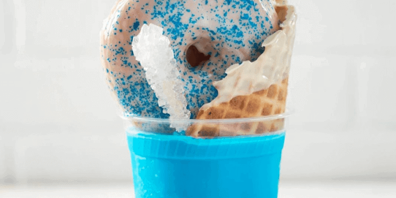 Next up, you’ll have to check out this totally Instagram-worthy Ice Castle Shake from Vivoli il Gelato. This Disney treat is made with blue birthday cake gelato, topped with a donut, and served with a waffle cone, whipped cream and sugar rock candy!