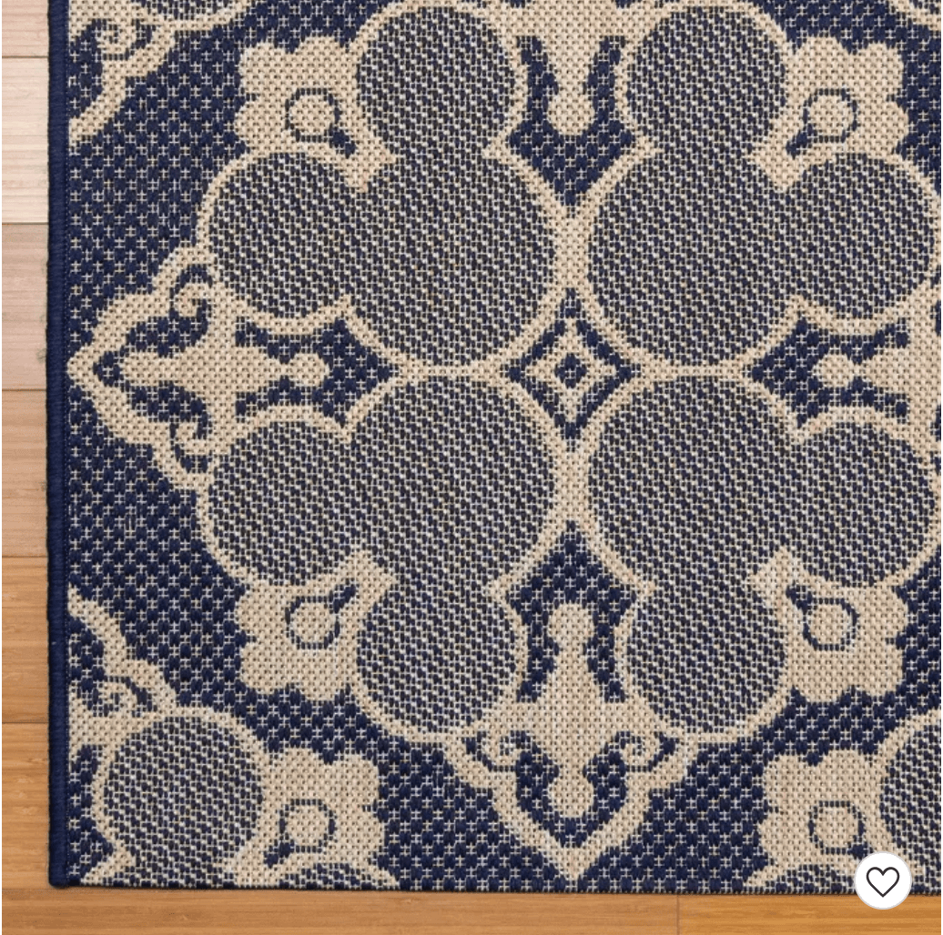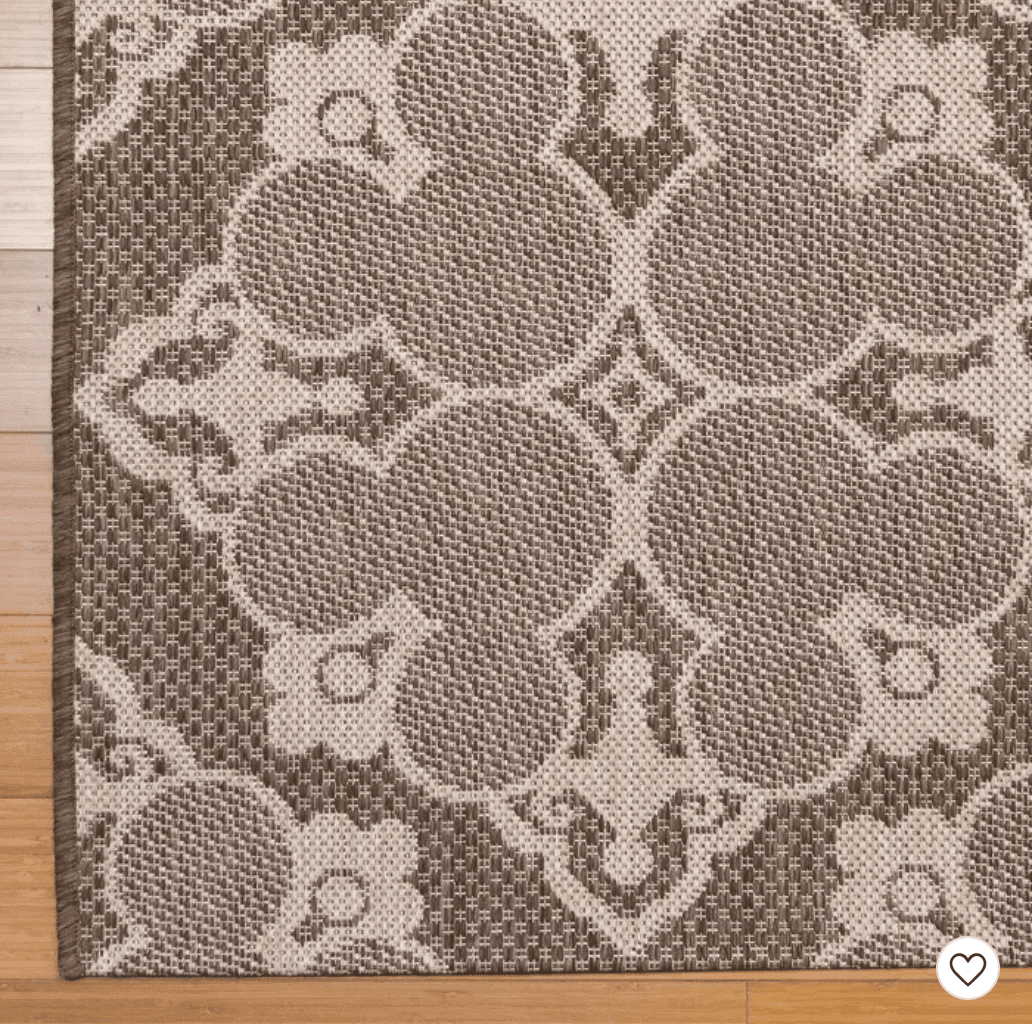The Chestnut Border Outdoor rug is available in 5’ x 7’, 8’ x 10’, and 9’ x 13’ and ranges in price from $79.99 for the smallest size to $249.99 for the largest one.