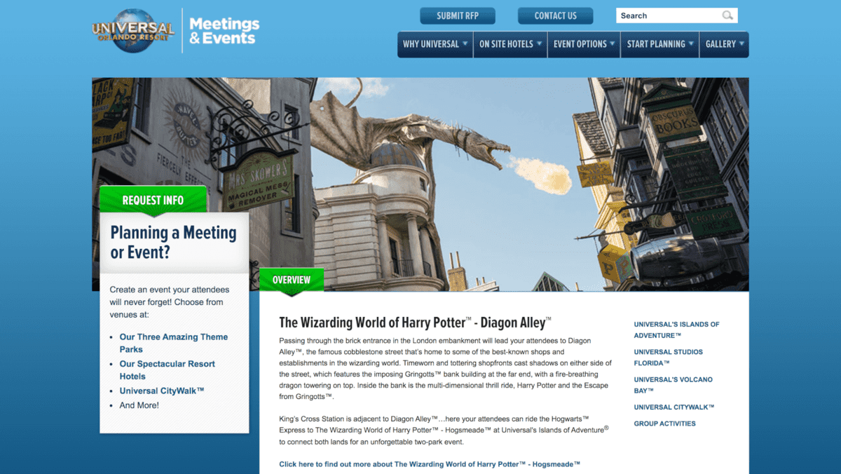To book your next event at Universal Orlando Resort, you must first go to uomeetingsandevents.com which states,