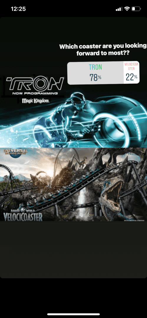 We have a poll running right now on our Instagram story, and we want to hear from you. At the time this article is being published, 78% say they are more excited for TRON with 22% saying they’re more excited for VelociCoaster almost 400 people have already participated in the poll.
