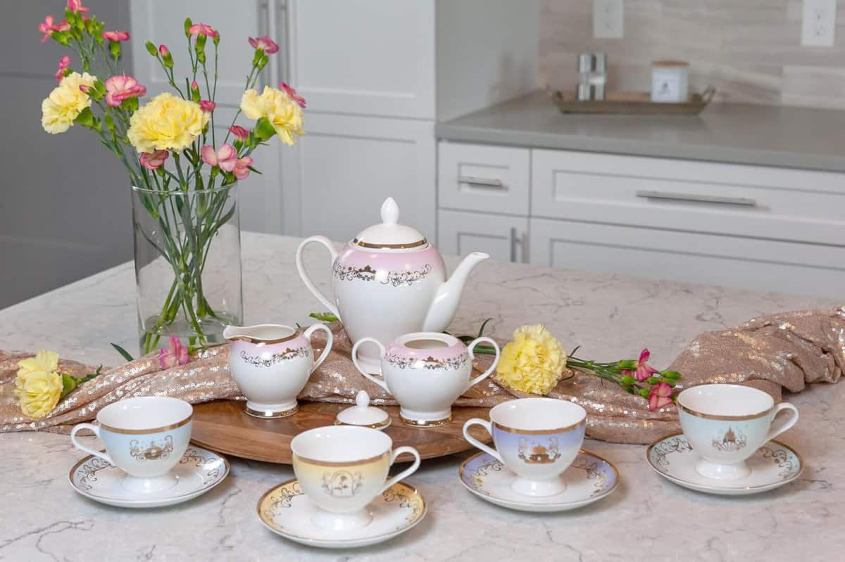You can see the individual Princess designs inspired by Ariel, Belle, Cinderella, and Jasmine. Four festive colors, hued to the Princess’ themes, glow from the rims, cascading down to a fading gradient. Gold rims on both cup and saucer bring the pieces together while marrying the regal designs to the Disney Princess dinnerware set.