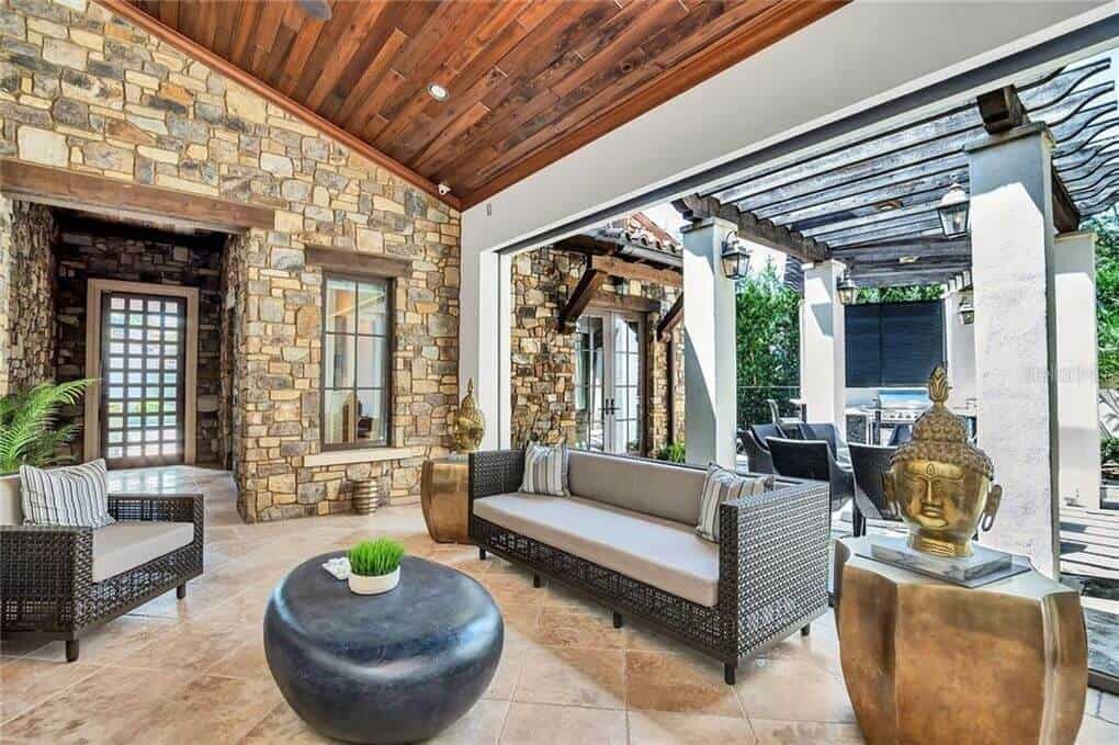 The entire property is 4,668 square feet and consists of the main house and a detached guest house, which feature a combined six bedrooms and six-and-a-half bathrooms. The two houses are connected by a garden path and are separated by a vast patio area with an outdoor kitchen.
