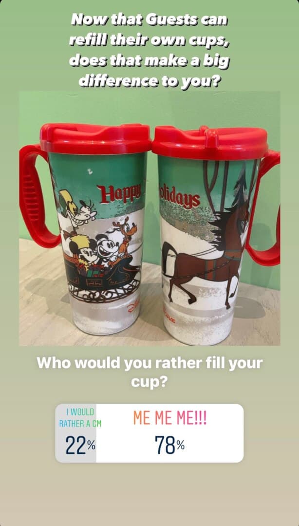 As we can see below, it seems the majority of Guests would also like to be the ones to refill their own cups with 78% voting in favor of the personal refill, and 22% wishing Cast Members were still the ones to do it.