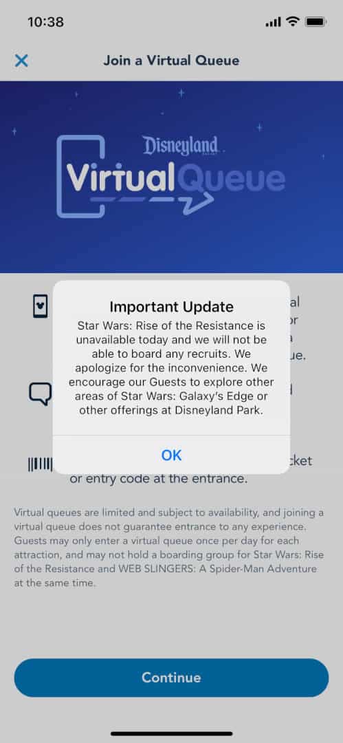 Star Wars: Rise of the Resistance is unavailable today and we will not be able to board any recruits. We apologize for this inconvenience. We encourage our Guests to explore other areas of Star Wars: Galaxy’s Edge or other offering at Disneyland Park.