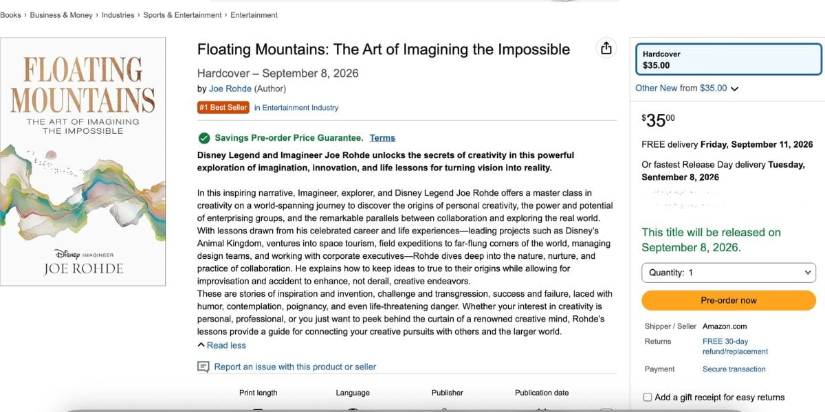 Floating Mountains quickly became a hit in Amazon’s Traveler & Explorer Biographies category, just days after its pre-order launch. This success highlights Joe Rohde’s popularity among Disney theme park fans and a general interest in behind-the-scenes content about Disney Imagineering and how beloved attractions are created.