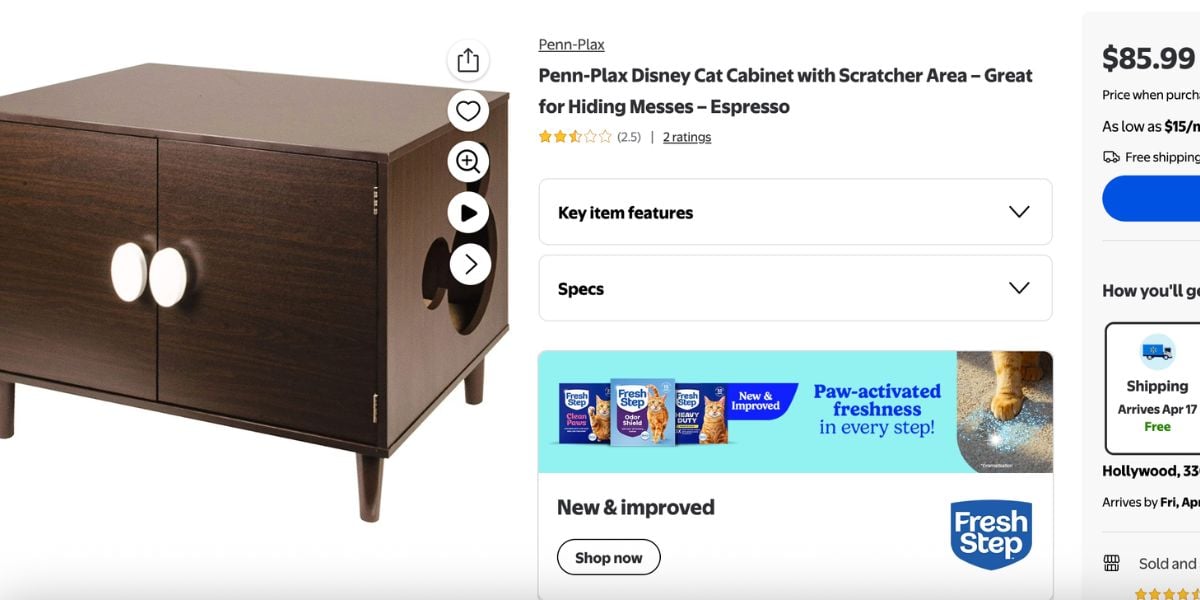 - Penn-Plax Disney Cat Cabinet — $85.99. A dark wood cat cabinet with two oversized white door handles designed to resemble the buttons on Mickey’s pants and a Mickey head-shaped cutout on the side as the entry point for cats. The furniture-style design means it doubles as actual home decor in a way most cat furniture does not.