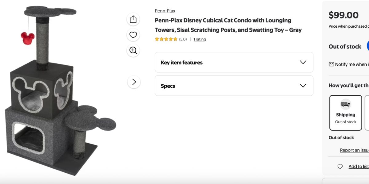- Penn-Plax Disney Cubical Cat Condo — $99. A multi-layer cat condo with scratching, hiding, and climbing areas built around Mickey Mouse motifs throughout the structure. The condo is several shades of grey with a bright red plush Mickey batting toy included.