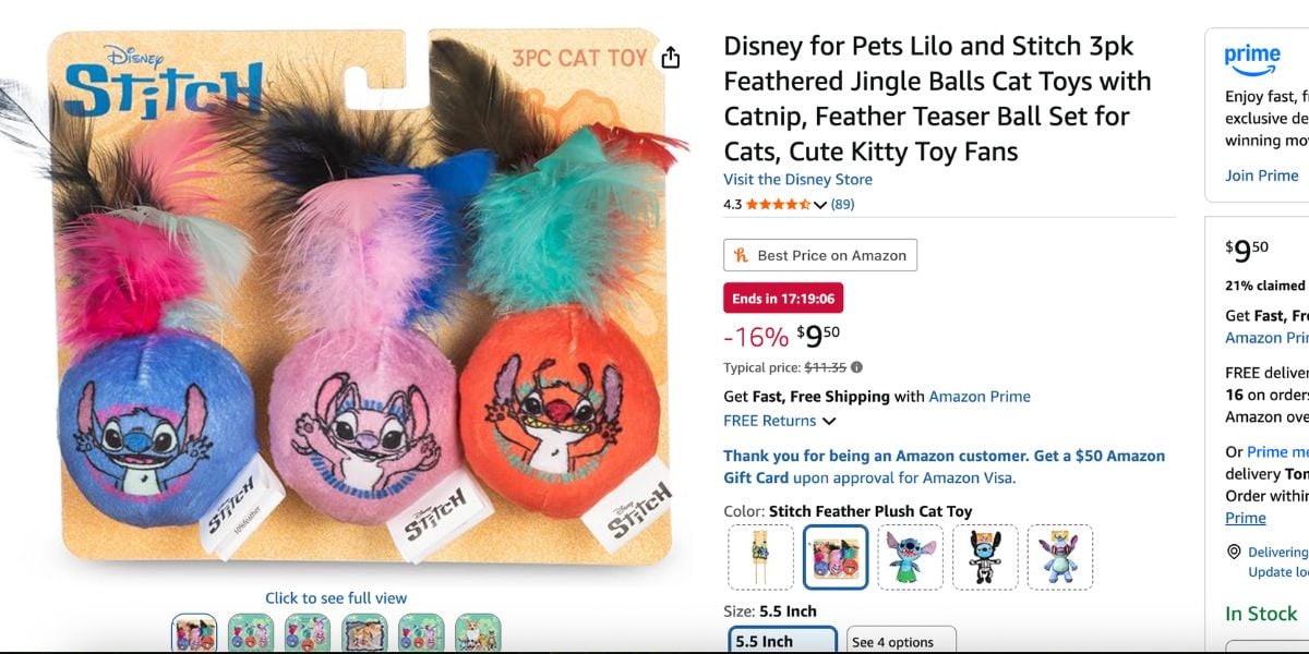 - Lilo and Stitch Hula Feather Wand — $11.15. A two-wand set featuring Lilo on one and Stitch on the other, each designed to look like the characters are doing the hula in their grass skirts. The wand format is one of the more reliably engaging toy types for cats, and the character design on these is genuinely charming.