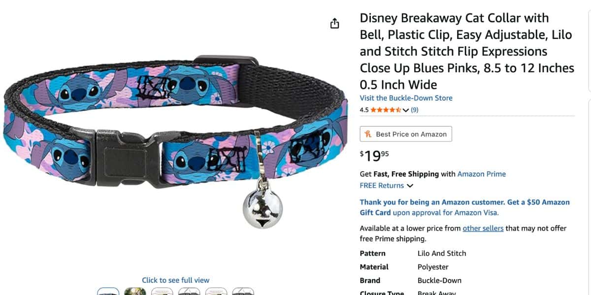 - Stitch Breakaway Cat Collar with Bell — $19.95. A blue collar with a pink floral pattern and Stitch’s face shown alternating right-side up and upside down around the band with a silver bell attached.