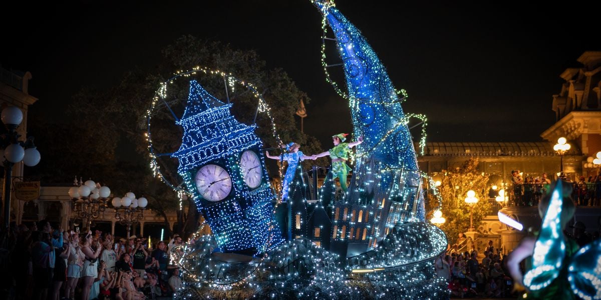 On April 9, 2026, approximately nine months after the parade’s July 2025 debut, the flying effect for both Peter Pan and Wendy became operational. The update introduces a flying effect that elevates both characters above the float and adds motion that draws the eye from a distance, transforming the sequence into the kind of vertical spectacle moment that nighttime parades use to create the visual peaks that guests remember and talk about afterward.