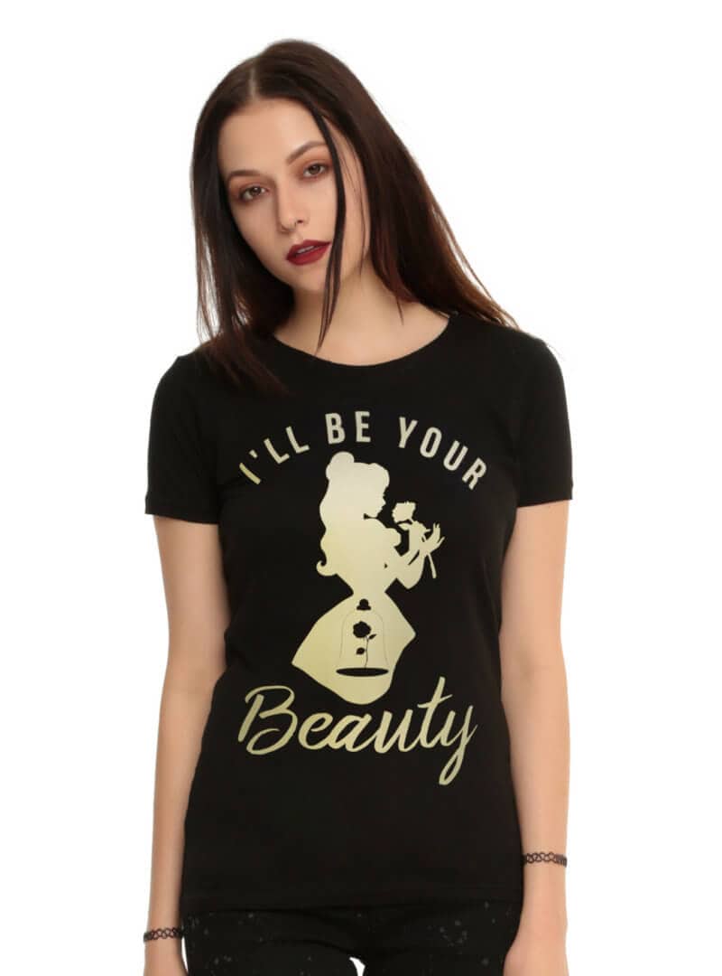 Fitted black tee from Disney’s Beauty and the Beast featuring a yellow Belle silhouette design on front featuring text that reads “I’ll Be Your... Read more.