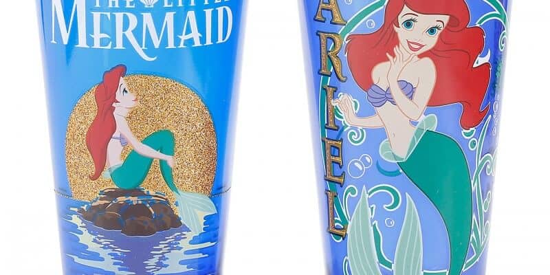 Set of 2 blue drinking glasses from Disney’s The Little Mermaid with Ariel themed designs. Open window gift box packaging.